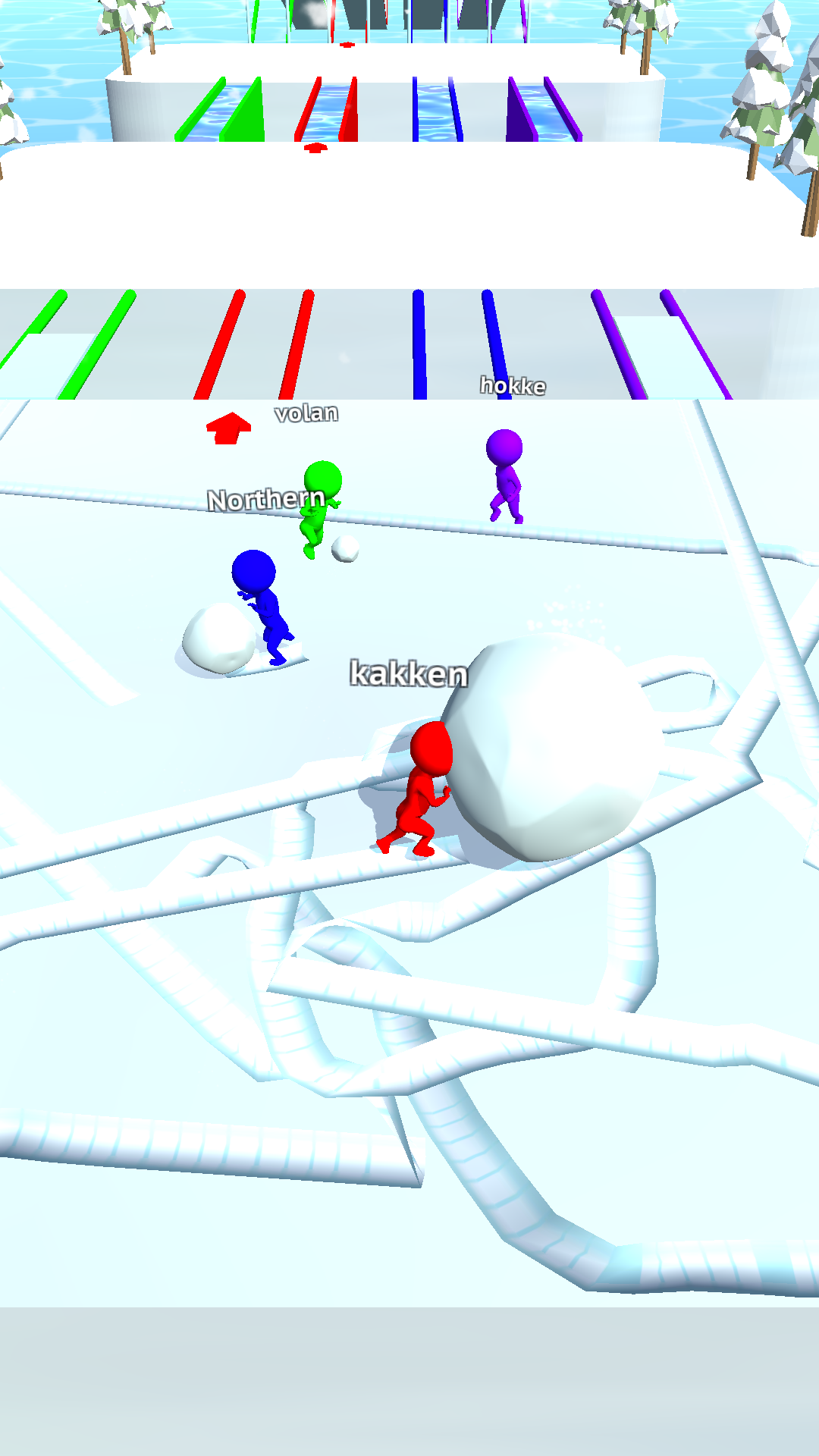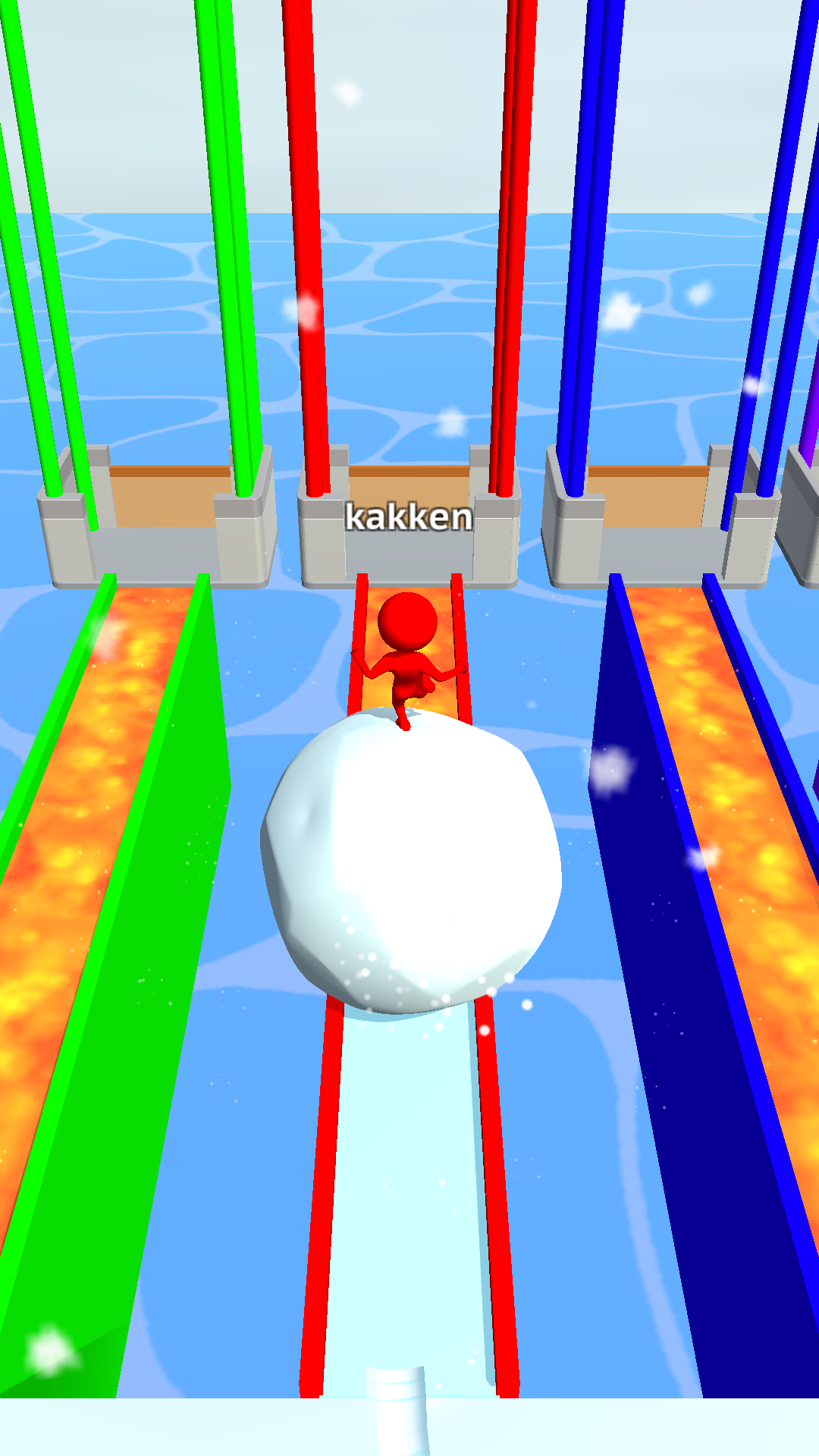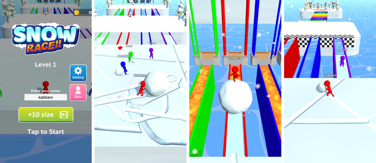 「Snow Race!!」は、雪を集めて大きくした雪玉を使ってライバルに負けないようギミックを突破するアクションレースゲームです。ステージ上に配置された様々なギミックを雪玉で突破しながら、一番最初にゴールまで到達することが目的のゲームとなっています。