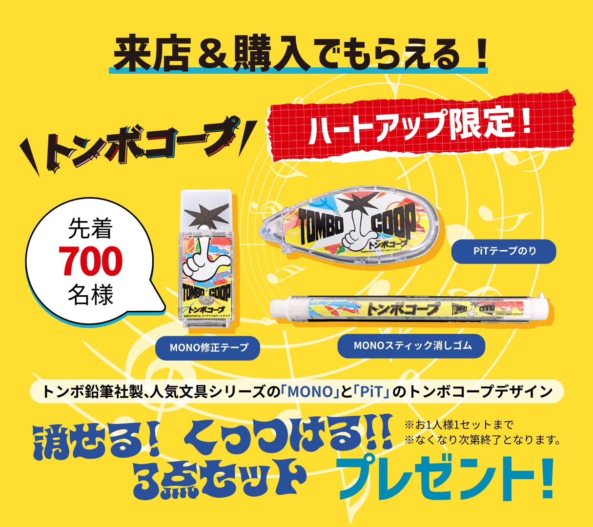 期間中、先着で「来店&クーポン提⽰」により限定クリアファイル、「学割で購⼊&クーポン提⽰」でここでしか手に入らない限定グッズをプレゼント。「ハートアップLINE友だち追加」で限定スマホ⽤壁紙が手に入る他、期間中キャンペーンサイトからの応募で、学生と一緒に作りあげるトンボコープ限定プレミアムライブ(公開収録)へのご招待も行います。