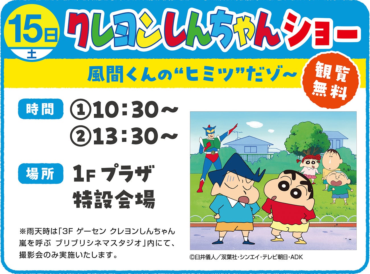 ※雨天時はクレヨンしんちゃんショーは中止となり、かわりに3Fゲーセン クレヨンしんちゃん嵐を呼