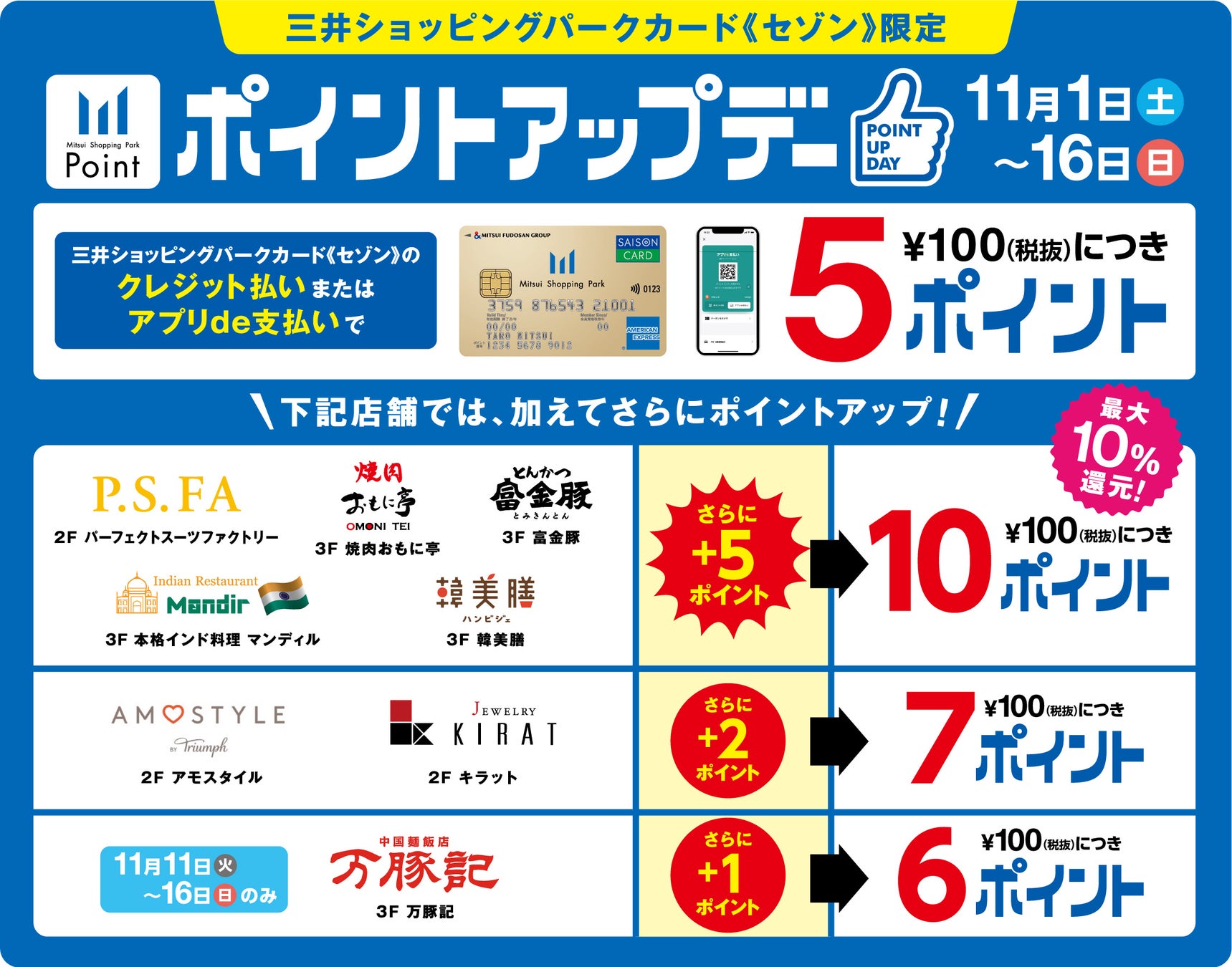 ■概要:三井ショッピングパークカード《セゾン》のクレジット払い、またはアプリde支払いでお支払いいただくと、通常100円(税抜)につき2ポイントのところ、5ポイント付与。さらに一部店舗ではショップ別ポイントアップも同時開催。
