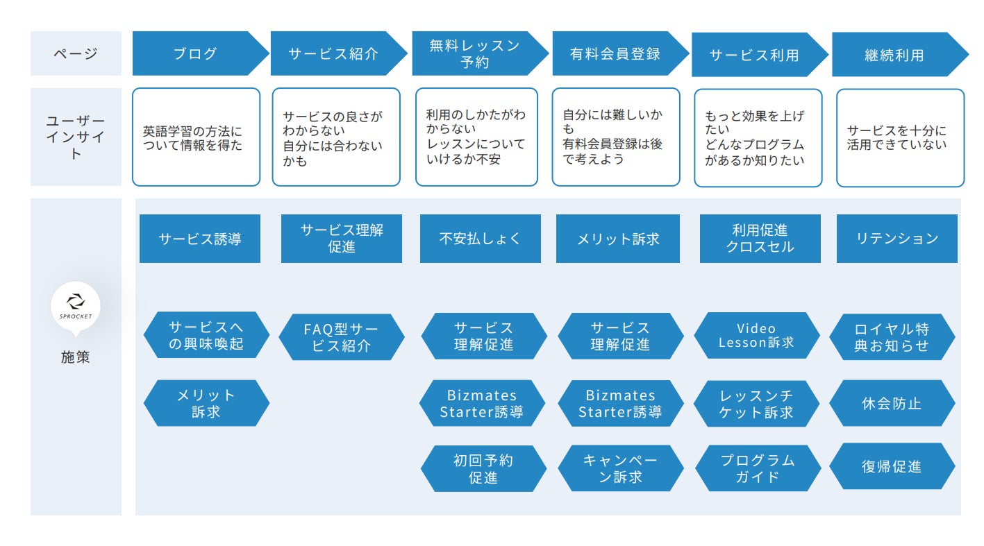 ビズメイツ株式会社では2020年2月から、Bizmatesの会員サイト、そして英語学習者への情報提供を行うオウンドメディアの2種類のWebサイトにおいてSprocketを導入しています。法人向けと個人のお客様向けのサービスがありますが、主に個人向けのマーケティング施策では「新規会員獲得」と「入会いただいたお客様のLTV最大化」の2つを軸に、2つのWebサイトにおいて認知からリテンションまでWeb接客のシナリオを用いた多様な施策を実施しています。