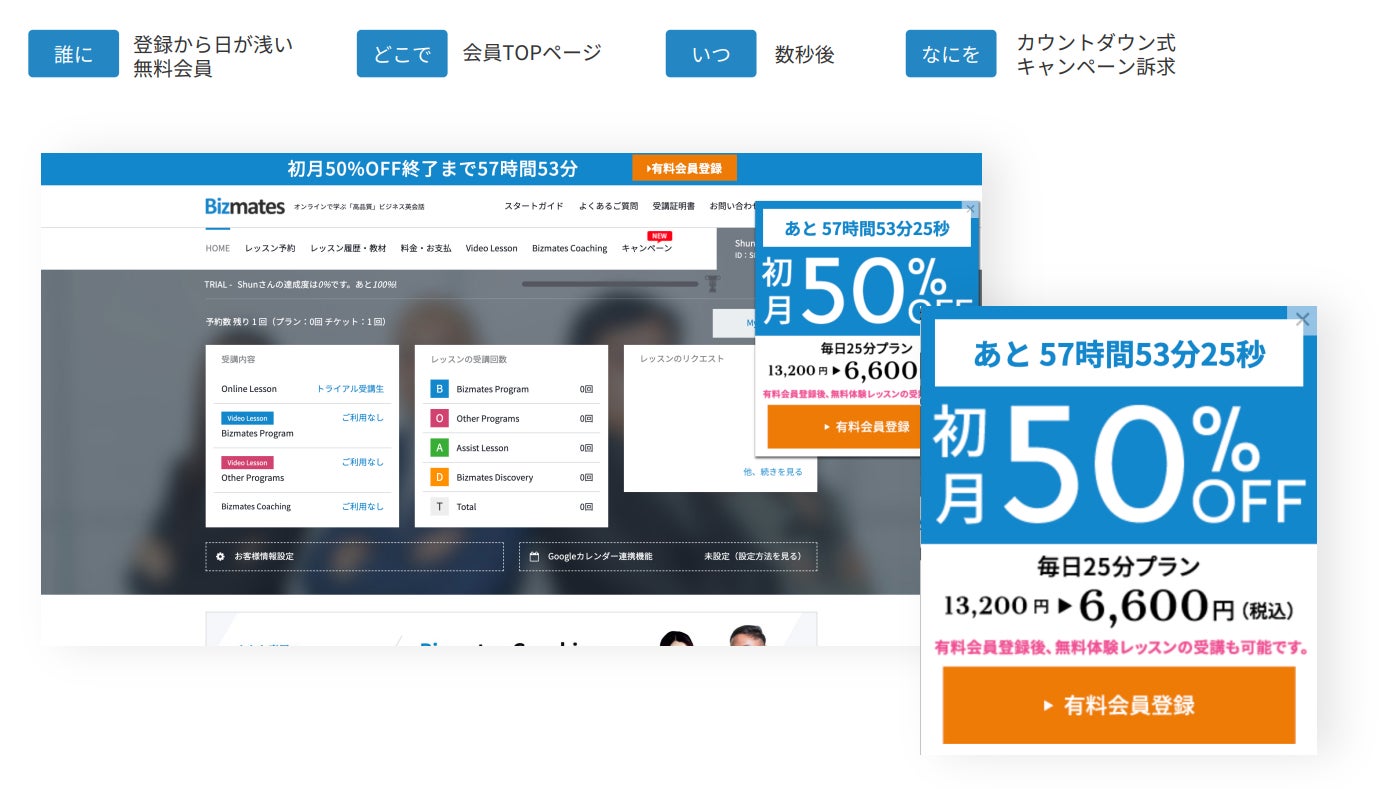 無料会員に登録後、無料体験レッスンを受講いただいたお客様に対し、初月の料金が半額になるキャンペーンを実施しています。キャンペーンの有効期間は無料会員登録から3日間のため、ユーザー行動履歴に基づきお客様ごとに「あと○時間」という形で正確な情報をカウントダウンでお知らせしたところ、無料会員から有料会員への登録促進で確実な成果を上げることができました。