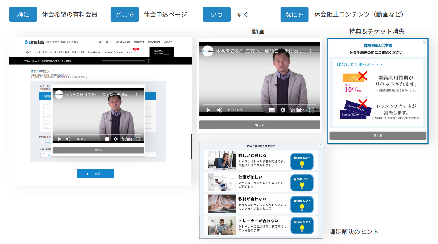 休会率を下げるために、休会申し込みページでは動画などを用いた有料会員の離脱防止施策を実施しています。オンラインで1人で学習されている方には、感情に訴えるメッセージが有効なため、休会申し込みページでは、ビジネス英語コーチHika(ビズメイツ㈱ 取締役 伊藤日加氏)が「こうしたら課題をクリアできませんか?」「もう少しがんばりましょう!」とエモーショナルな励ましをする動画を流しています。結果、休会率が従来の91%となり9%の改善効果が出ました。また、休会すると会員で受けられていた特典がなくなることを訴求するシナリオでは10%以上の成果が出ています。