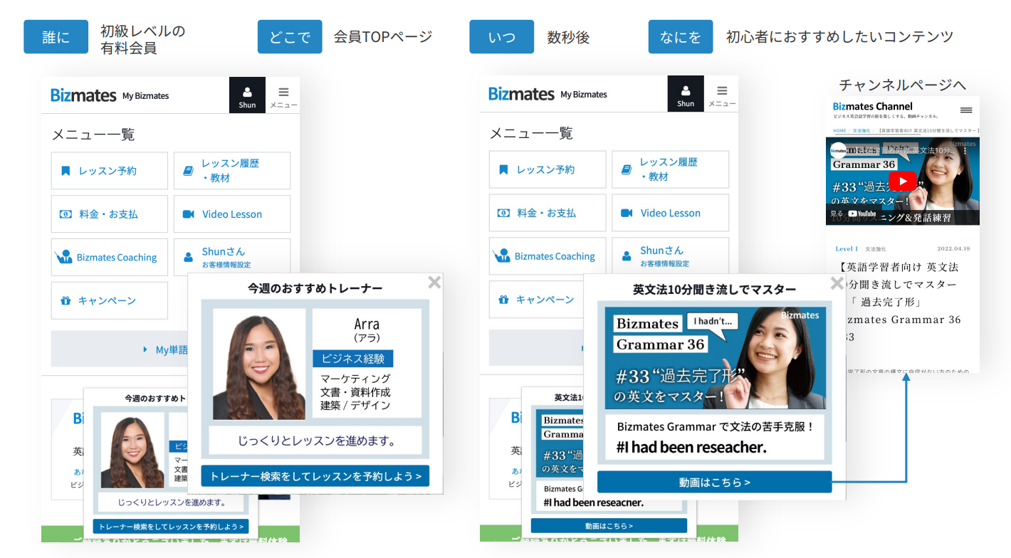 有料会員に対しては、次のレッスンの予約率を上げたり、利用したことがないプログラムを紹介したり、学習のモチベーションを保つ施策が重要になります。例えば、「英会話が怖い」「どう学習していいかわからない」という英語学習を始めたばかりお客様に、会員サイト上で「フレンドリーに話します」「英語を教えた経験があります」といったトレーナーのパーソナルな情報をポップアップで表示し、初心者の方の不安を払拭したところ、非表示のパターンと比較して予約完了率が115%に改善されました。