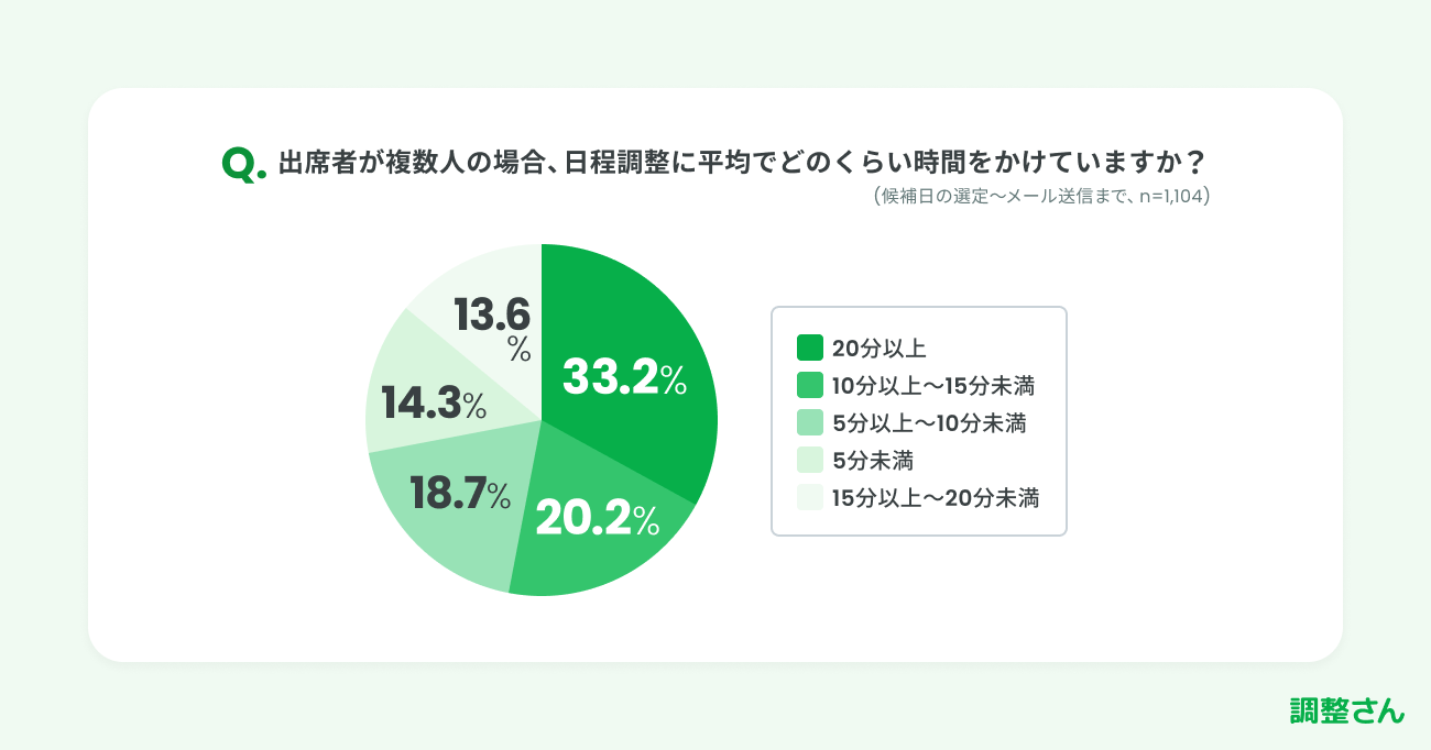 調査では、出席者が複数人の場合の日程調整にかかる時間についても質問しました。候補日の選定からメールを送信するまでの平均時間について聞くと、最も多かったのは「20分以上」で、有効回答数1,104のうちの33.2%となりました。また、2番目に多かったのは「10分以上〜15分未満」で20.2%でした。一方で、出席者が自分1人の場合については「5分未満」と回答した人が最も多く、35.5%となりました。