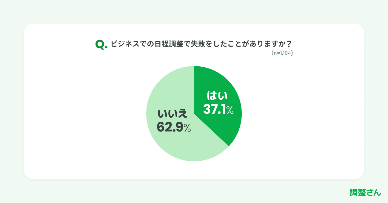 社外との日程調整を効率化するために日程調整ツールを使用していない人に対し、ビジネスでの日程調整で失敗をしたことがあるか聞いたところ、37.1%が「はい」と回答しました。