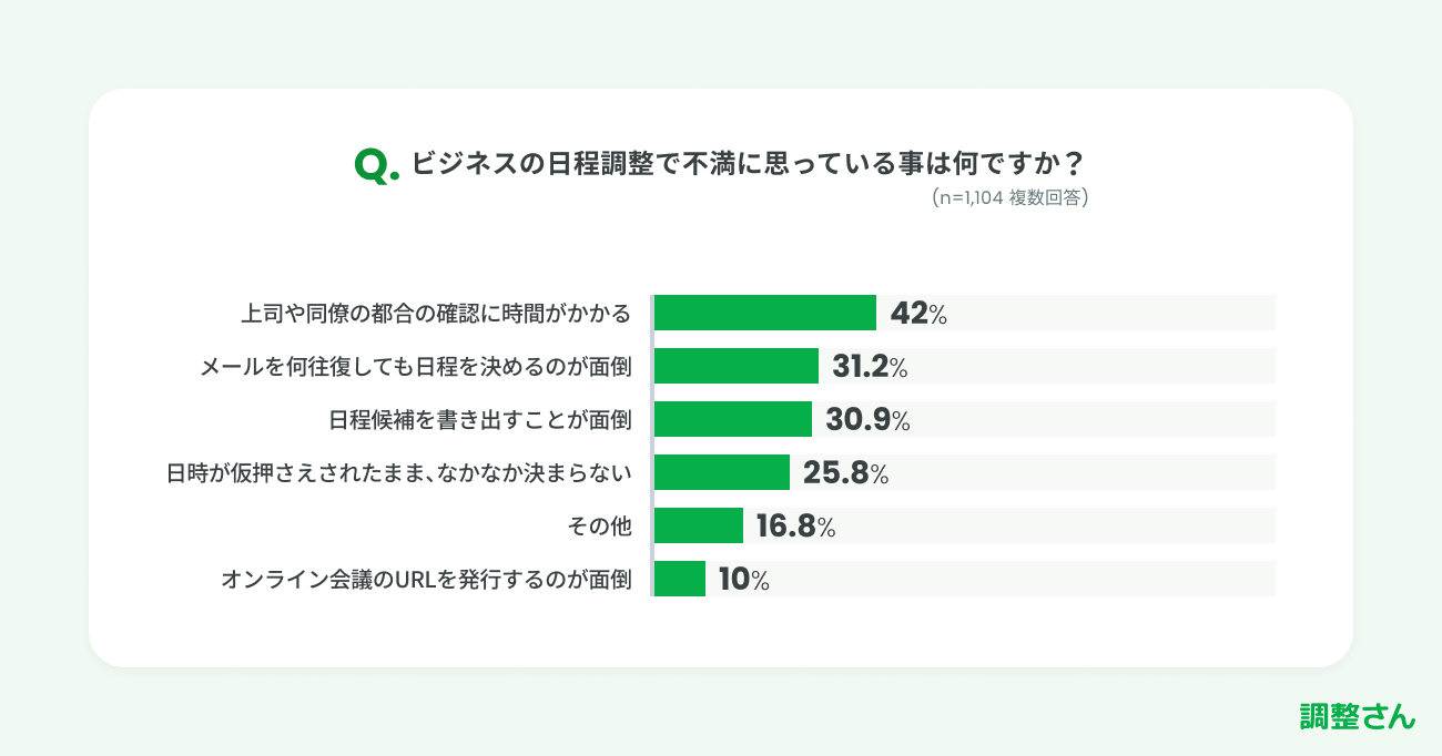 ビジネスの日程調整で不満に思っている事について複数回答で質問したところ「上司や同僚の都合の確認に時間がかかる」が最多で、42%となりました。また「メールを何往復もして日程を決めるのが面倒」が、31.2%で2番目の多さとなりました。
