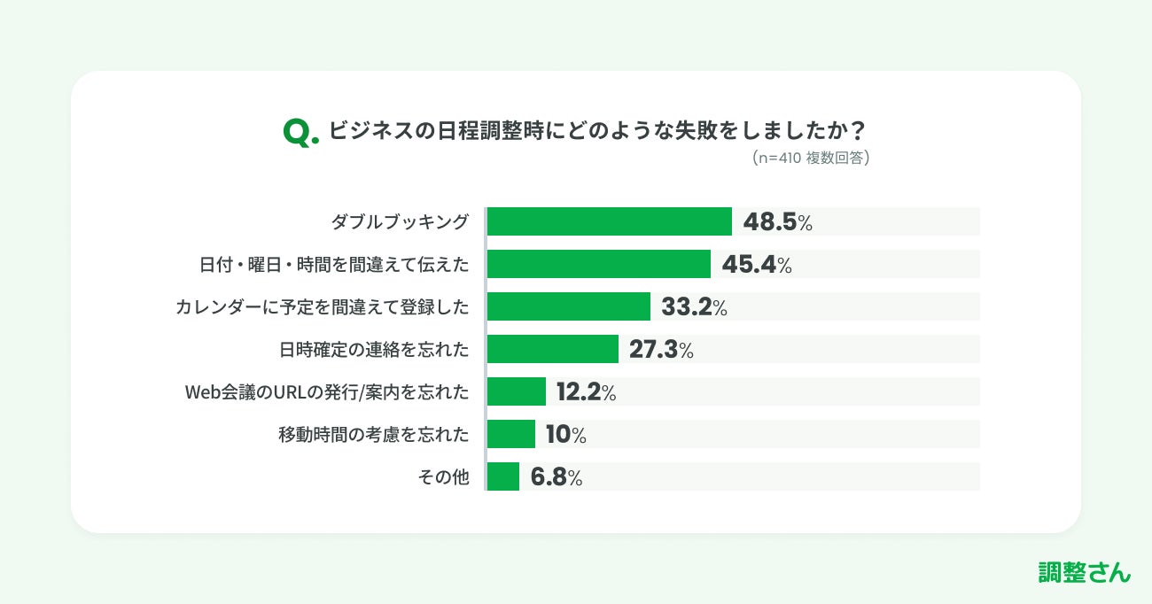 上記の質問で「ビジネスでの日程調整で失敗をしたことがある」と答えた人を対象に、具体的な失敗について聞きました。複数回答で質問したところ、1位は「ダブルブッキング」で、約半数となる48.5%が選択しました。また2位は「日付・曜日・時間を間違えて伝えた」で、45.4%となりました。これに「カレンダーに予定を間違えて登録した」(33.2%)や「日時確定の連絡を忘れた」(27.3%)が続きました。