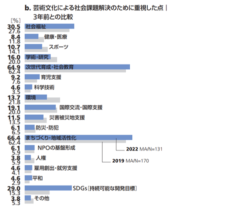 ●メセナ活動の取り組み目的について、『芸術文化による社会課題解決のために重視した点』としては、「まちづくり・地域活性化」が66.4%と最も多かった。3年前との比較でもプラス4ポイントとなった。