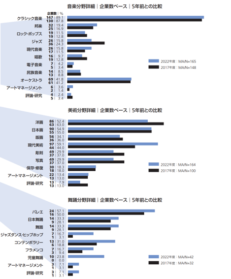 ●音楽分野詳細では「現代音楽」、美術分野詳細では「現代美術」など、新しい分野での活動が増加している。