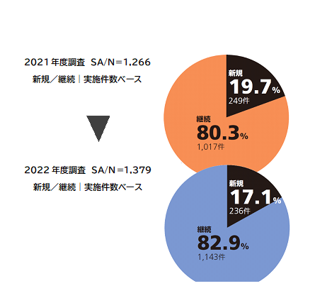 コロナ禍が継続する状況下であったが、企業のメセナ総活動数は1,379件となり、前年度調査の1,266件より113件増加し、新規活動も2割弱の割合を維持している。