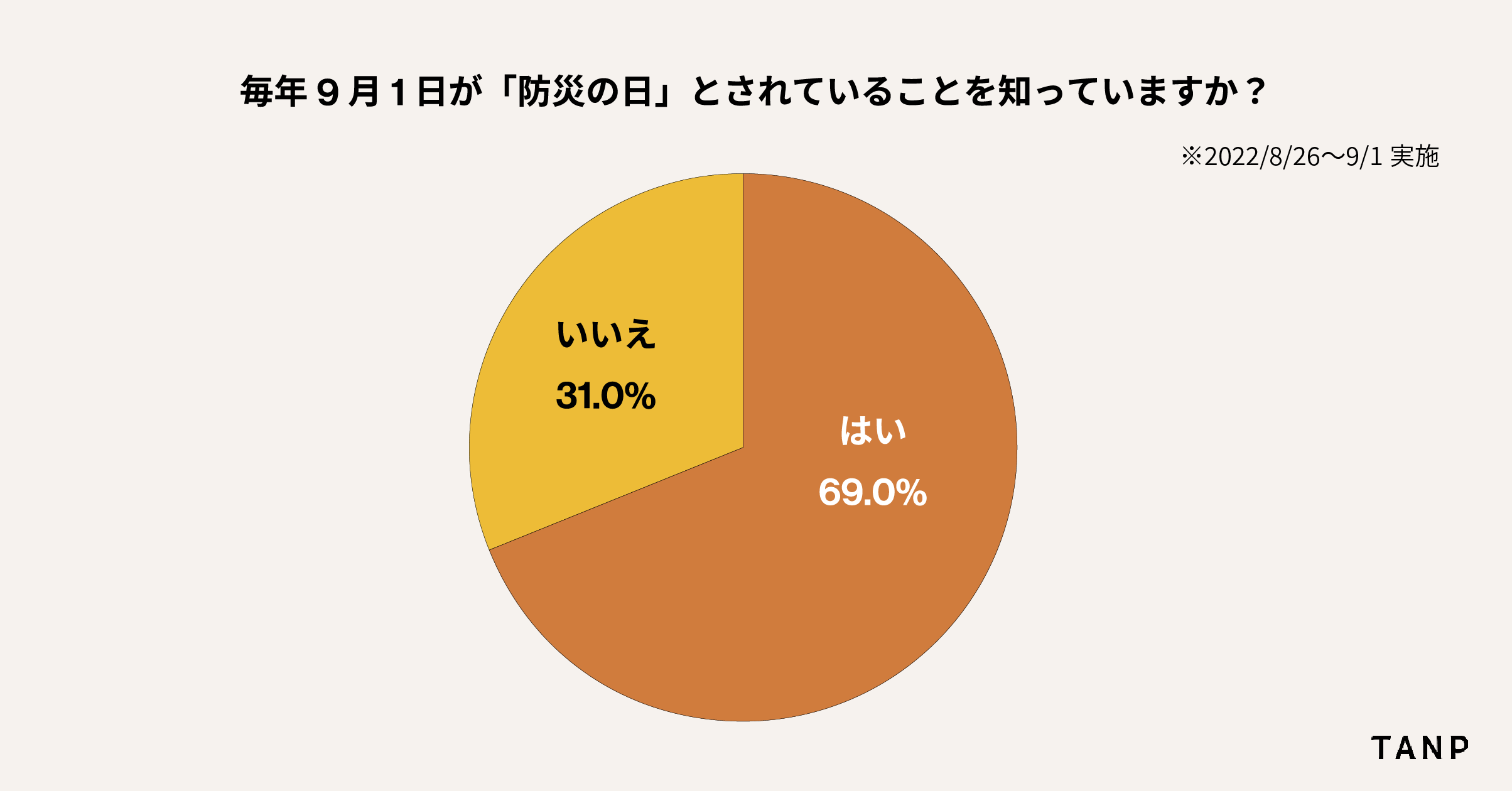 TANP会員を対象とした本アンケートでは、約7割が「9月1日が防災の日であることを知っている」と回答。一方、学校や企業を含め広く取り組みがされている防災の日ですが、約3割の回答者からは「知らない」の回答が集まりました。