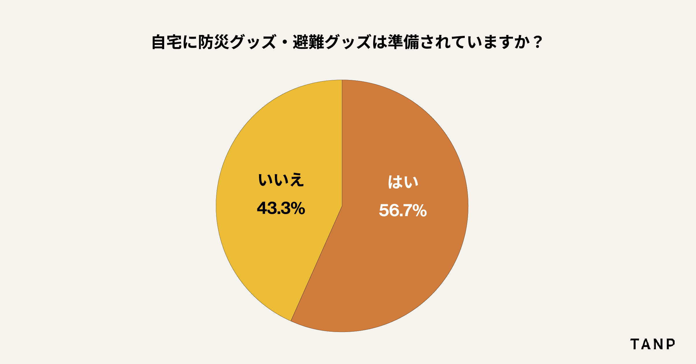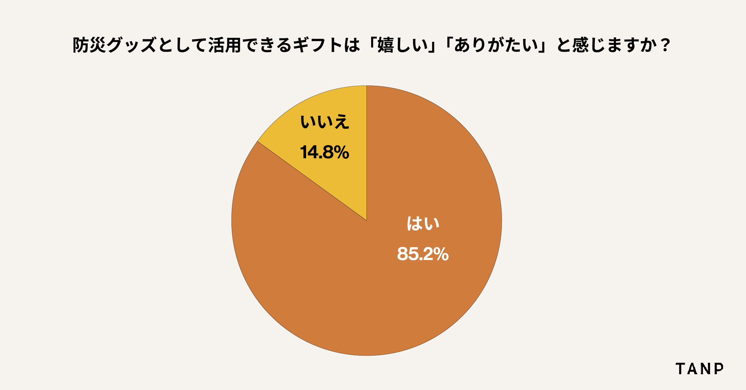 「自宅に防災グッズ・避難グッズは準備されていますか?」という設問では、約6割の回答者が「はい」と回答。後述する「防災グッズとして活用できるギフトは嬉しい、ありがたいと感じますか?」という設問では約9割が「はい」を選択していることからも、手間や費用、優先順位などから「備えたい気持ちはあるが手が回っていない」事情も想像されます。