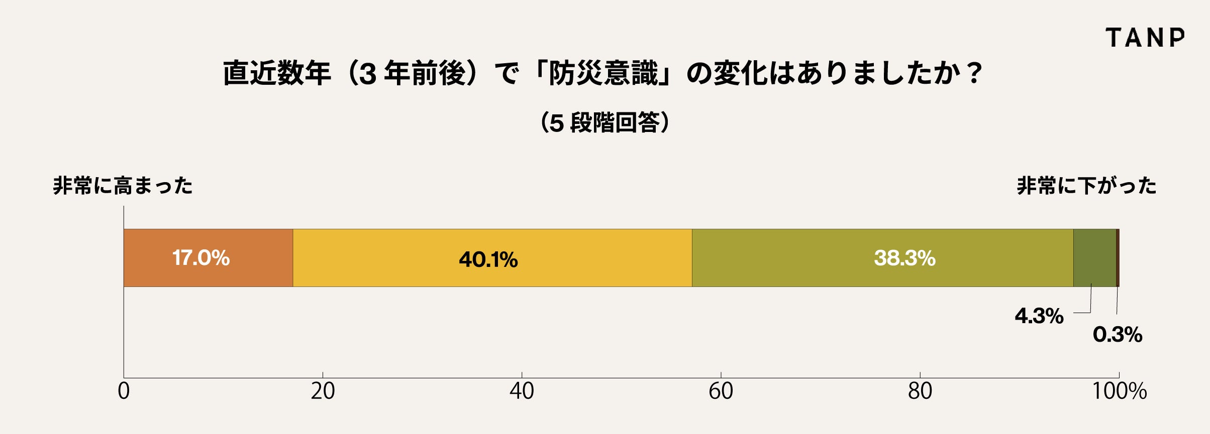「この数年で防災意識の変化はありましたか?」という設問では、約6割の回答者が「やや高まった」「非常に高まった」と回答。一方「やや下がった」「非常に下がった」の回答は0.5割未満に止まりました。