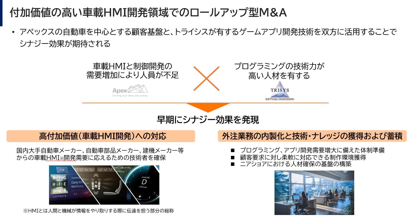 アペックスでは、トライシスが有するゲーム・アプリ開発の人材を活用して、「成長領域」かつ「高付加価値領域」 である「HMI 開発」の売上高を、3年以内に、現状の1.5倍以上にすることを目指します。