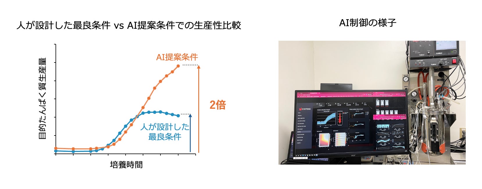 このたび、味の素株式会社(以下、味の素社)と共同で、ちとせのAIを培養制御が特に難しいとされる糸状菌の培養に適用したところ、人が設計した最良条件と比較して、たんぱく質の生産性を約2倍に向上させることに成功しました。