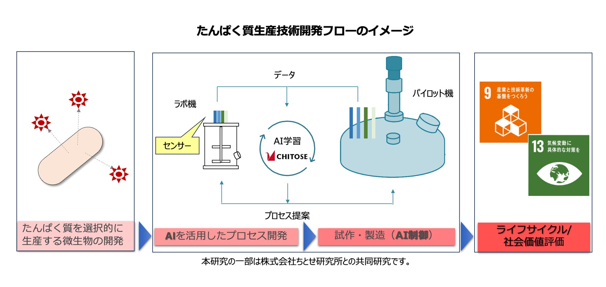 さらに、本研究の成果は、NEDOが公募した「バイオものづくり革命推進事業」において、味の素社のテーマである「環境保護と食品供給の安定化を実現する精密発酵技術の開発」(※3)に活用されることとなりました。AI制御技術を活用したたんぱく質生産プロセスの開発を行い、迅速かつ高い生産性の実現を目指すという内容です。