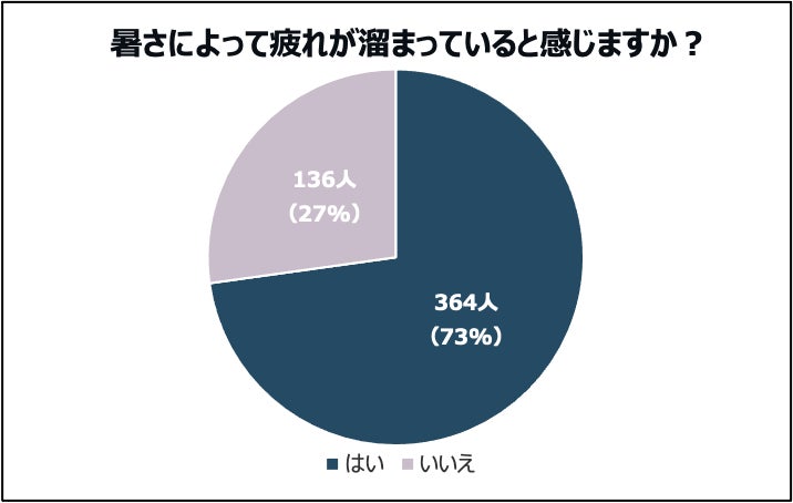 また「暑さによって疲れが溜まっていると感じている」と回答したのは364人(73%)で、さらに「今年の夏は例年よりも睡眠不足を感じている」と314人(63%)が回答し、夏の疲労を取り除けていない人が多くいることがわかります。