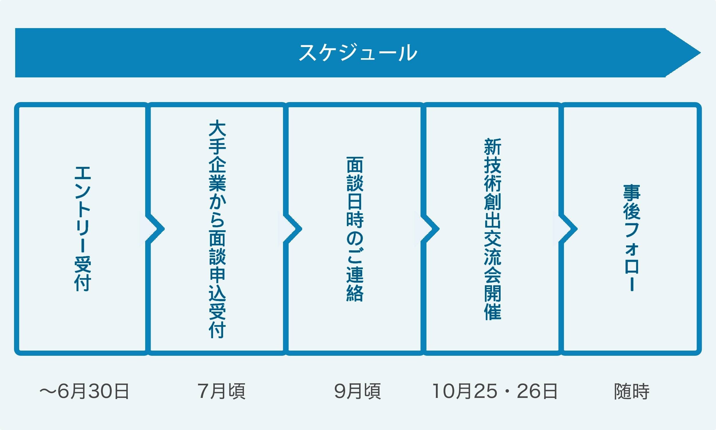 ※エントリーいただいても、大手企業等から10/25・26の面談申込(指名)が無い場合は新技術創出交流会(個別面談会、製品展示会)にご参加いただくことができません。予めご了承ください。