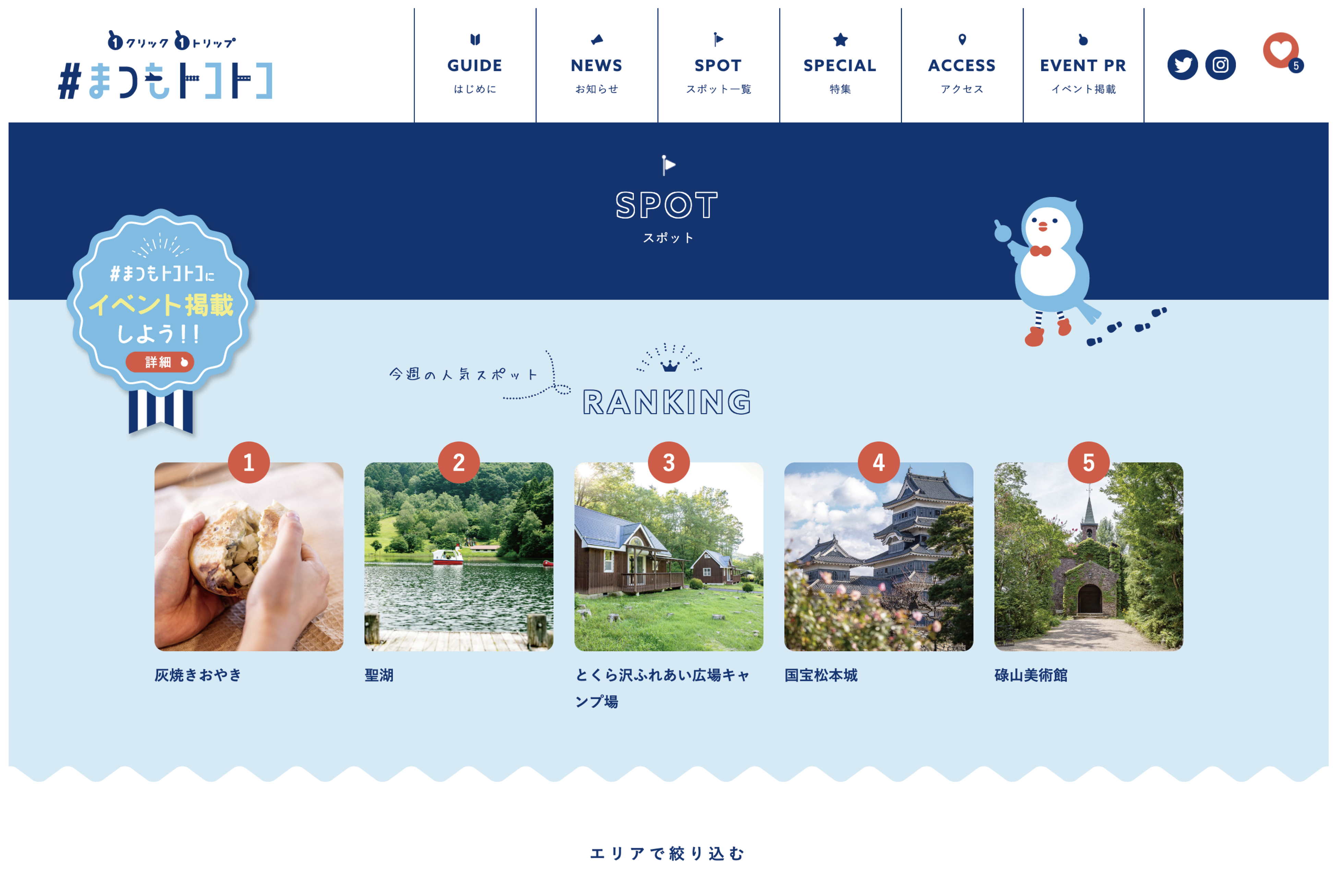 松本広域連合が運営する「#まつもトコトコ」通称 「まつトコ」は、信州・松本エリアの8市村(松本市、 塩尻市、安曇野市、生坂村、筑北村、麻績村、山形 村、朝日村)の観光スポットやイベント情報を気軽 に、素早く、見つけられる観光情報サイトです。「1 クリック1トリップ」をコンセプトに、写真から気 になるスポットを探すことができます。タグ検索で、 簡単に目的のスポットを調べたり、気になるスポッ トを、お気に入り登録すると、おすすめ観光エリア を「はっち」が教えてくれます。