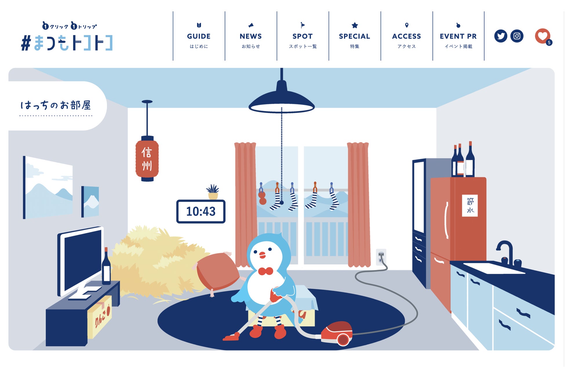 「はっち」は「#まつもトコトコ」の観光ナビゲー ター。信州・松本エリアの観光スポットやイベ ント情報を中心にご紹介しています。ちょっと お節介で信州愛がすごい。お酒(特にワイン)とそば茶が好物で、口癖は「ぴゅん」。散歩や登 山が好きな鳥のキャラクターです。「#まつもトコトコ」サイト内には「はっち」をクリックして見ることができる隠しページ「はっちの部屋」もあります。