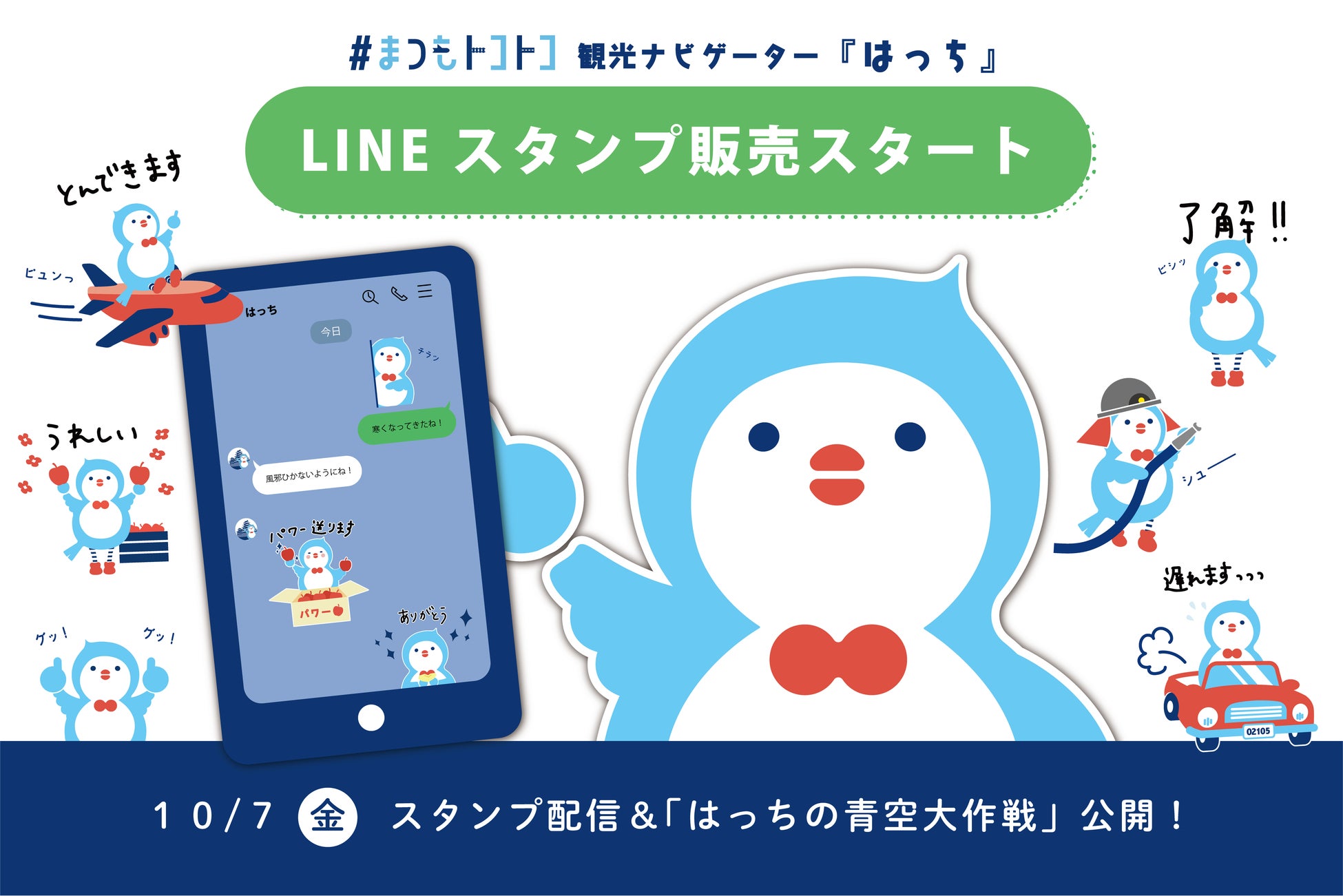信州・松本エリアの特産品を交えたご当地スタンプと、定番スタンプの全40種類が登場。ご当地スタンプは、まずは地元の人に使ってもらうことがコンセプト。地元の人同士の普段使いの他、地元を離れた家族や友人に送ることで、話のネタやきっかけとしても使えます。定番スタンプは日常で使いやすいラインナップ。「はっち」のスタンプを使って、家族や友人への連絡など、楽しくトークできます。 配信リリースと同時に、LINEスタンプ販売記念イベント企画「はっちの青空大作戦!」も公開。「はっちLINE スタンプ」の購入によって楽しめる企画です。