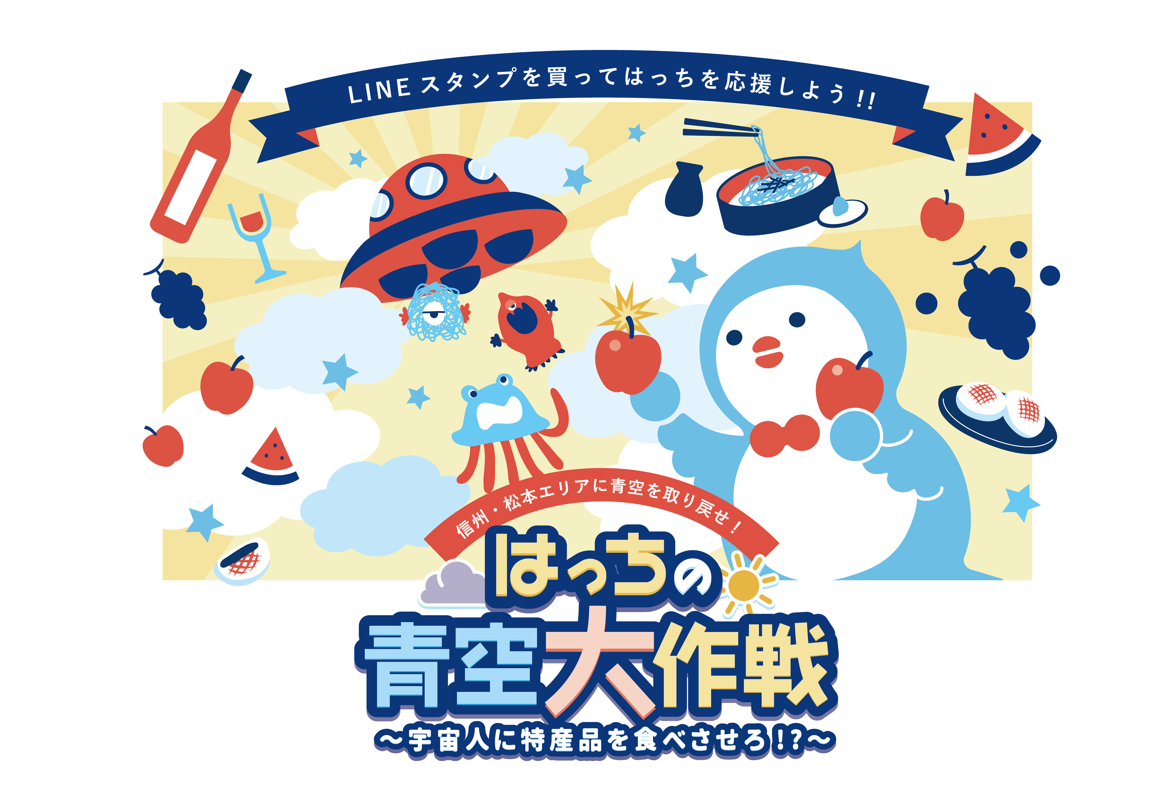 「はっち」LINEスタンプ販売記念イベントとして、まだまだ認知度の低い「はっち」を、LINEスタンプを購入して、応援する企画がスタート。ストーリーは、認知度ゼロを知って落ち込んだ「はっち」の元に、宇宙人が現れて信州・松本エ リアを曇りだらけにしてしまいます。LINE スタンプの購入者数に応じて、「はっち」のやる気が アップしていき、パワーアップしたはっちが、 信州・松本8エリアの特産品を活かしながら青空を取り戻していくストーリーです。