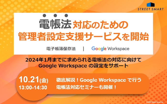 企業や教育機関のDXを支援する株式会社ストリートスマート(所在地:大阪府大阪市、代表取締役:松林大輔、以下:ストリートスマート)は、電子帳簿保存法(以下、電帳法)に対応する Google Workspace の管理者設定支援サービスの提供を、2022年10月1日より開始いたします。