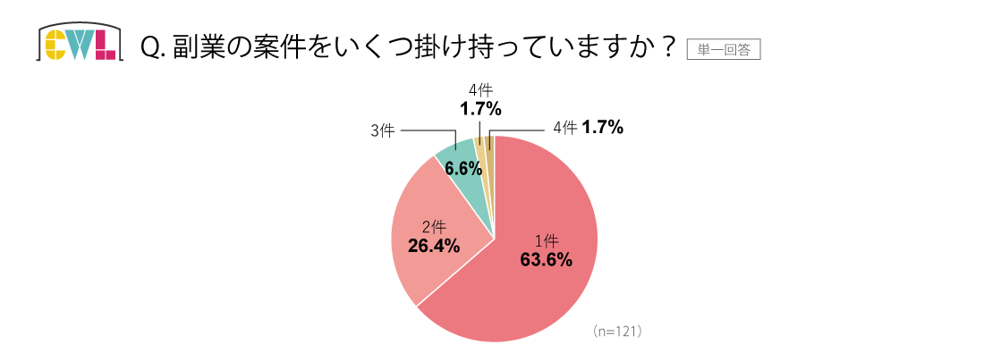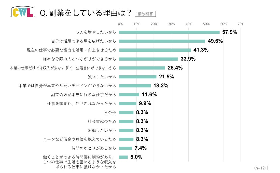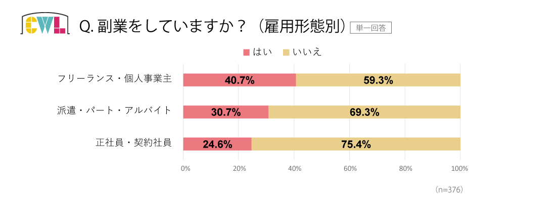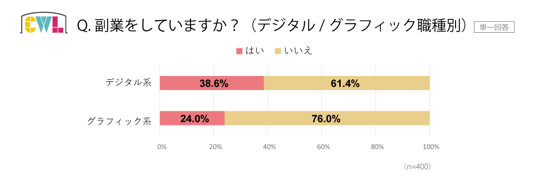 また、一般職では正社員が5.9%とにとどまりましたが、CWLで行った今回の調査では、クリエイターは24.6%の割合で副業をしていることになり、クリエイターは比較的副業に向いている職種ということなのかもしれません。