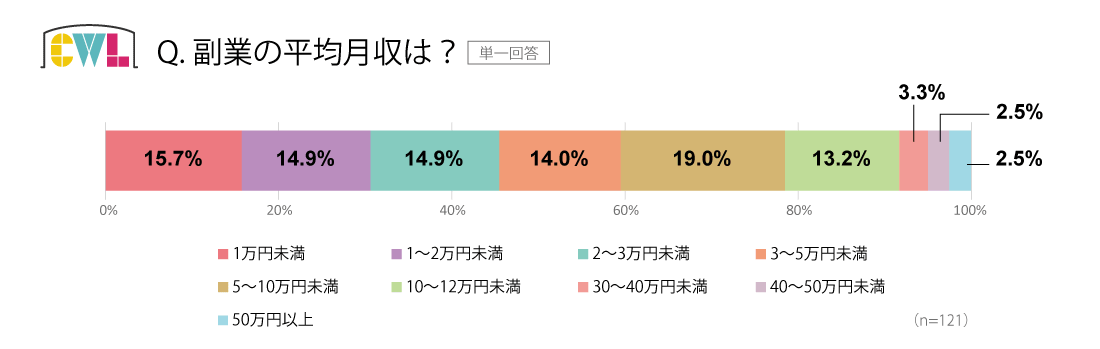 副業の件数が1~2件が90%以上を占めていたの対し、月収を見るとかなり細分化されたことから、1件の案件に対する単価に違いが出ていることが分かります。