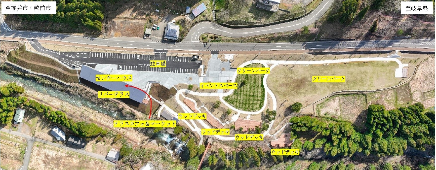 「道のオアシス フォーシーズンテラス」は、福井県池田町と岐阜県揖斐川町を結ぶ「冠山峠道路」の延長線上である一般国道417号沿いに立地しています。福井県の玄関口であり、遠路からの来訪者を迎える場所として、日本の原風景が残る環境を活かしながら、情報発信、物産販売、人的交流、道路利用者の休息サービスを提供していきます。