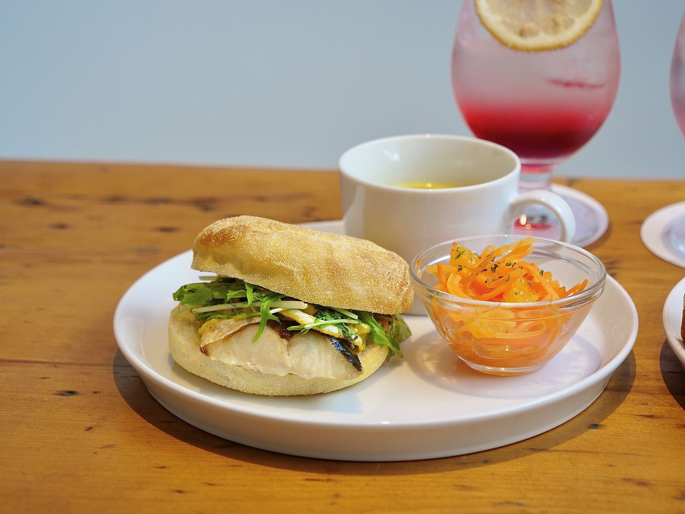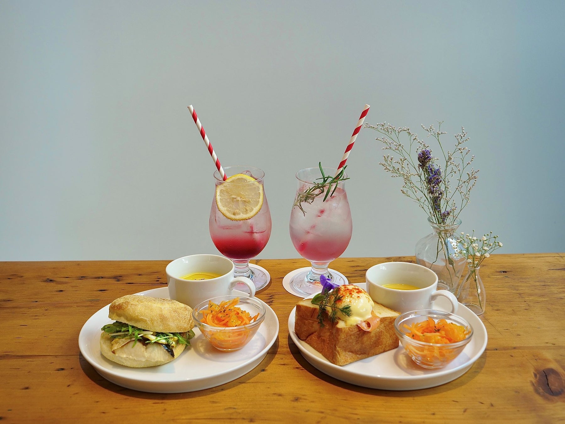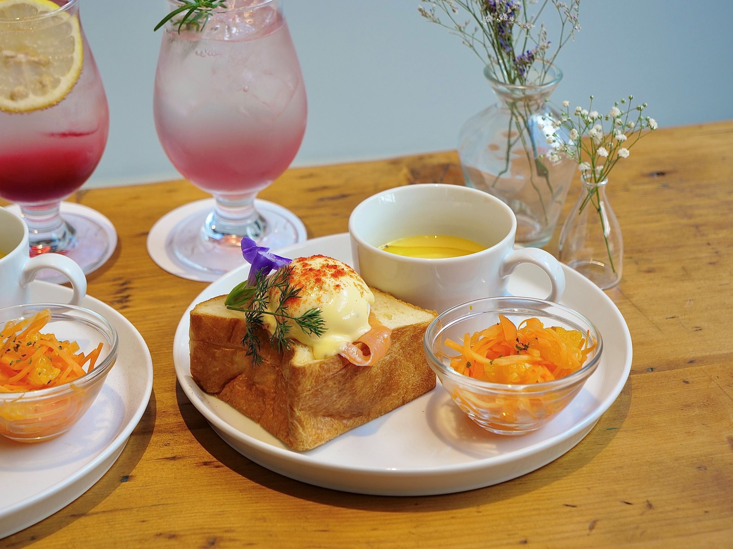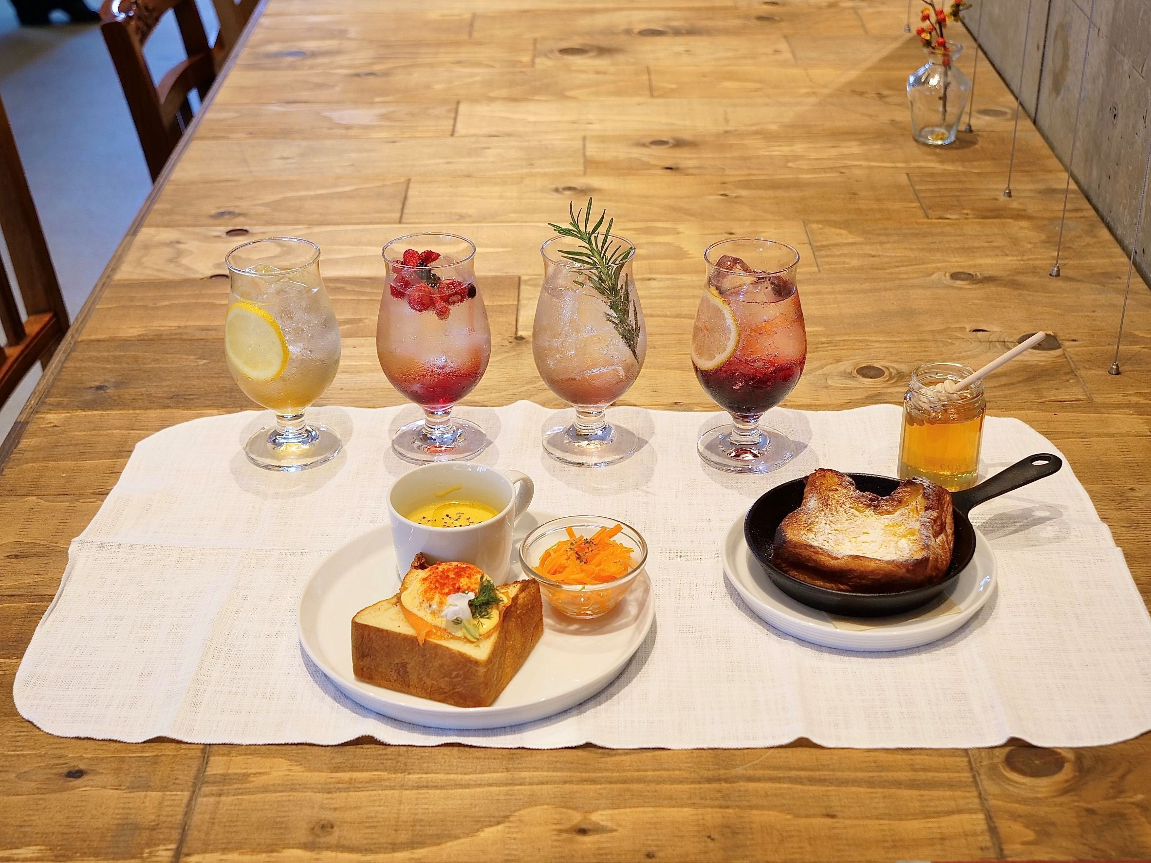 ■メニュー:ウフマヨトースト・フレンチトースト・パニーニ・パフェ、お花のソーダ(ローズ、ラベンダー、カモミール、ハイビスカス)・パン約30種類など…