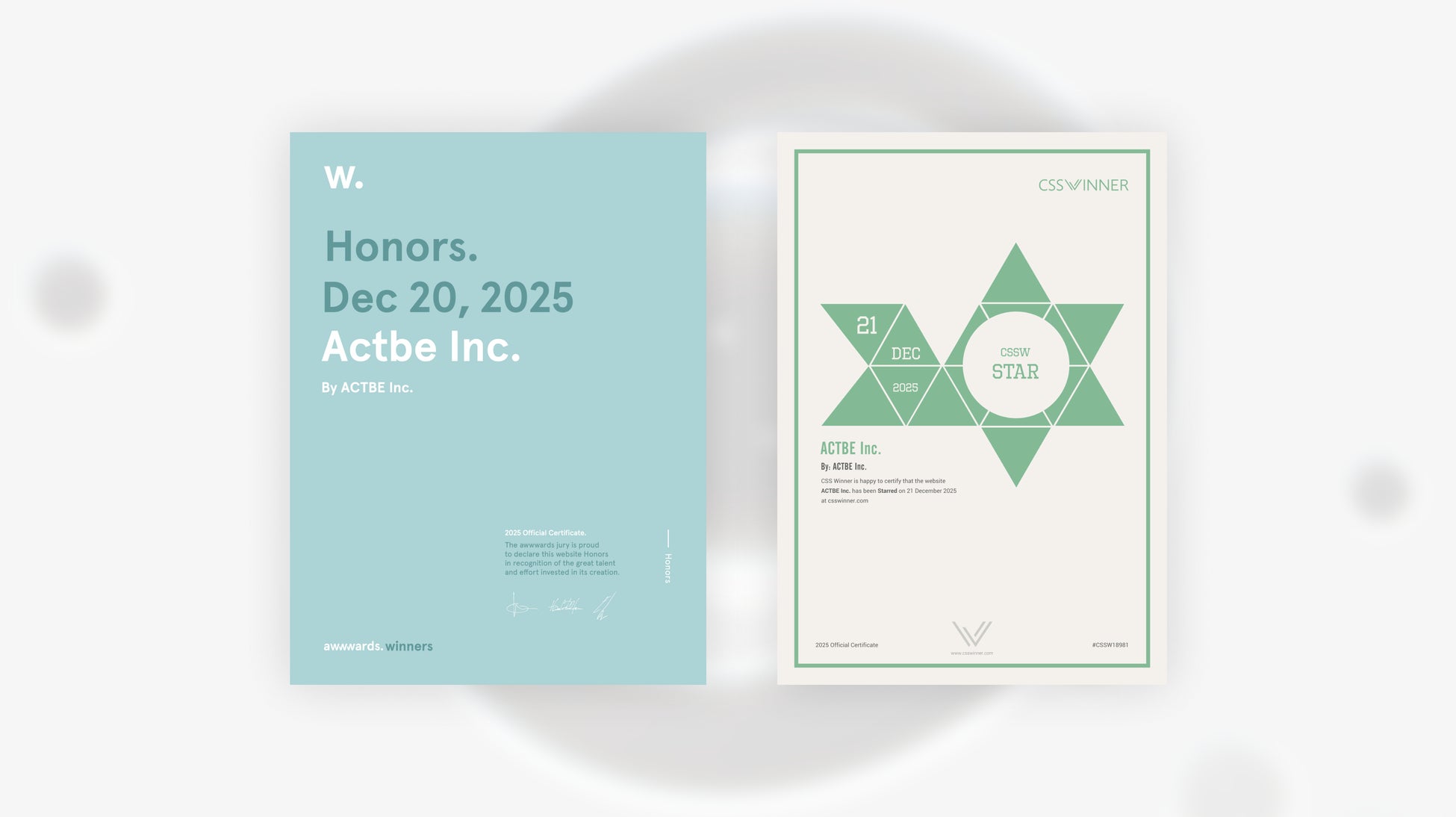 株式会社アクトビ(本社:大阪府大阪市中央区、代表取締役社長 兼 CEO:藤原 良輔、以下「アクトビ」)は、自社のコーポレートサイト(https://actbe.co.jp)が、世界で最も権威あるWebデザインアワードである“Awwwards(アワーズ)”において「Honorable Mention」を、Webデザイン・実装技術の評価アワード“CSS Winner”において「STAR」を受賞したことをお知らせします。