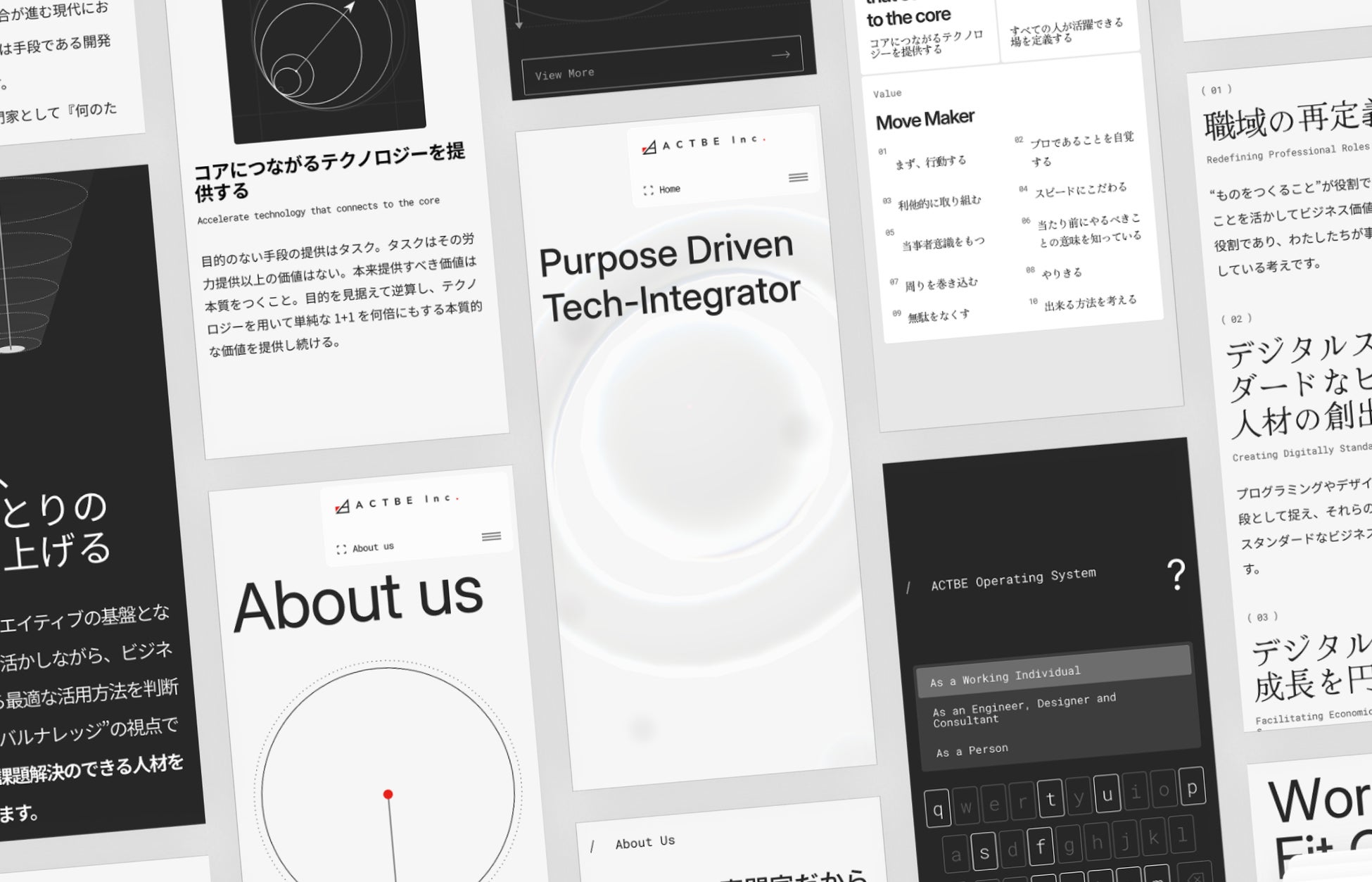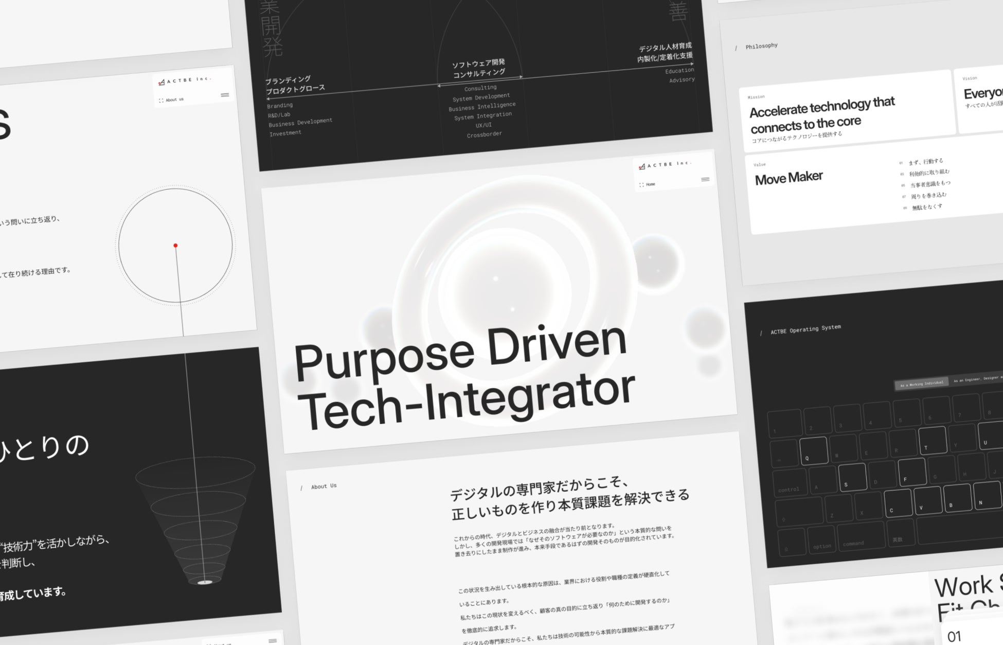 今回の受賞作となった本サイトも、まさにその思想を体現したものです。 根底にあるのは「アクトビの在るべき姿」への問いであり、サイト全体を通じて「Purpose Driven Tech-Integrator(パーパスドリブンテックインテグレータ®)」というポジショニングを定義。私たちが何者であるかを、一貫したデザインで示しました。