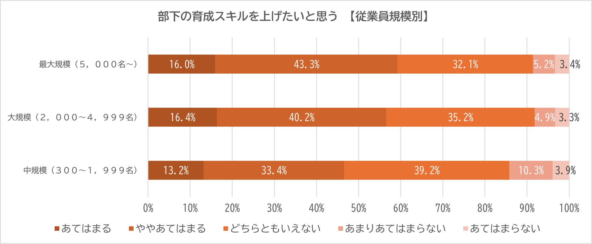 従業員規模別に見てみると、従業員規模が多くなるに連れて「あてはまる」「ややあてはまる」の割合が増加傾向にあることがわかる。最大規模の企業に所属するマネジメント層は、約6割が育成スキルの向上に意欲的である。