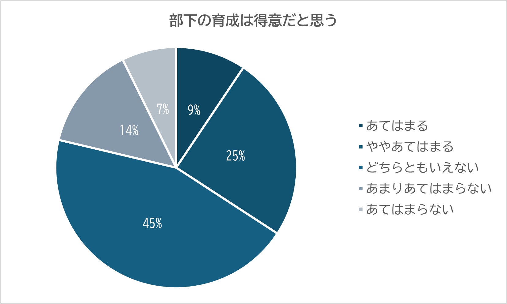 「あてはまる(9%)」「ややあてはまる(25%)」と回答したのは全体の34%を占めた。「あまりあてはまらない(14%)」「あてはまらない(7%)」の合計21%より10ポイント以上高い結果となり、自身を「部下の育成が得意」と評価しているマネジメント割合の多さもうかがえる。
