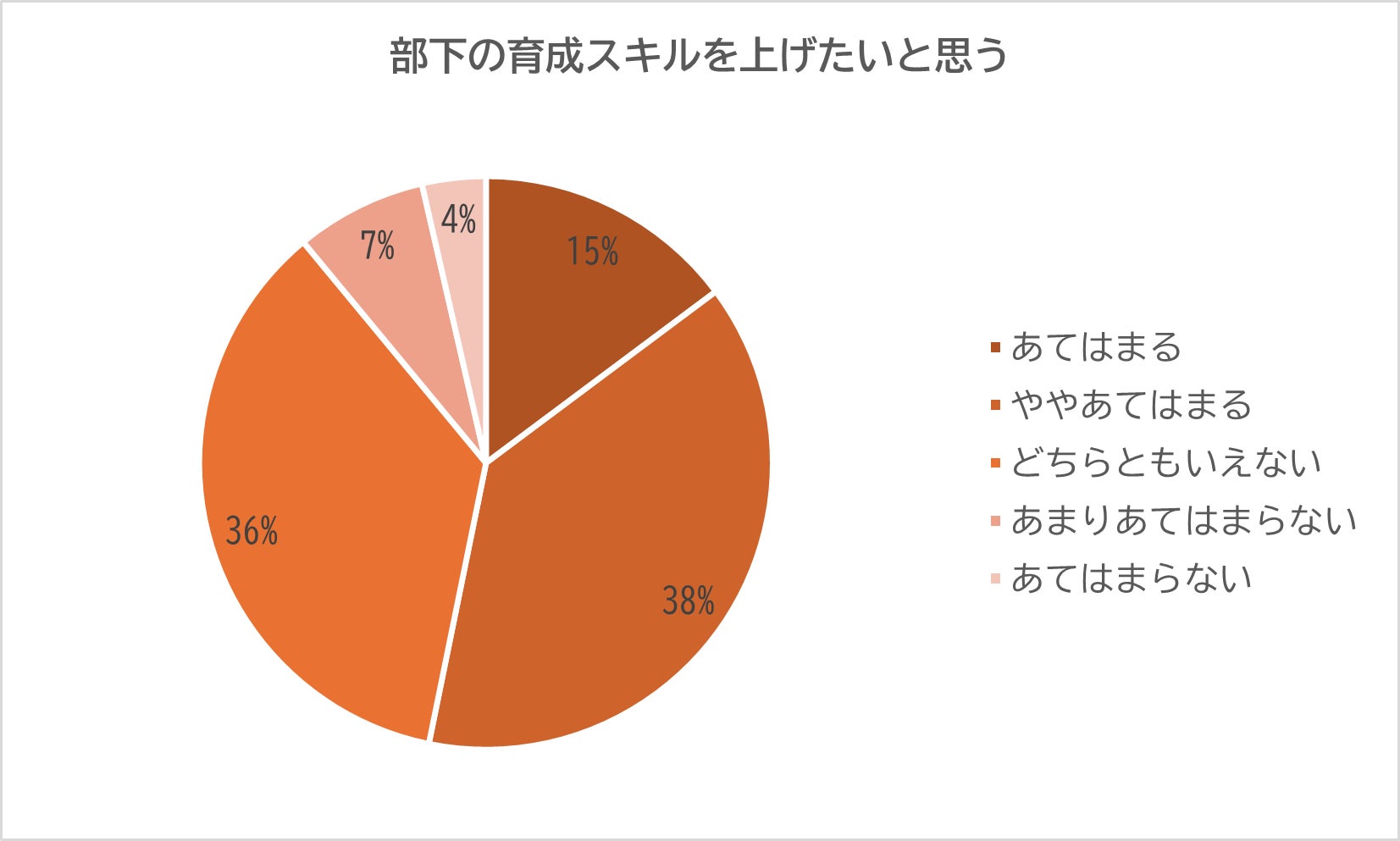 「あてはまる(15%)」「ややあてはまる(38%)」と回答したのは全体の53%を占めた。「あまりあてはまらない(7%)」「あてはまらない(4%)」の合計11%の5倍ほど高い結果となり、部下の育成スキルの向上に意欲的なマネジメント層の多さがうかがえる。