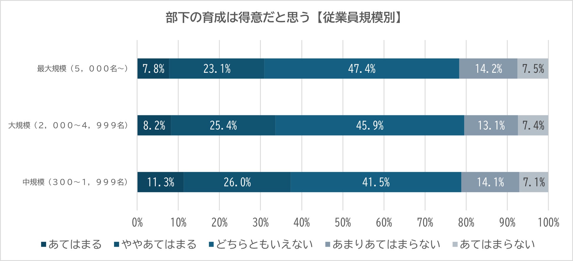 従業員規模が小さい企業ほど、部下の育成を得意とする割合が多い傾向も明らかに