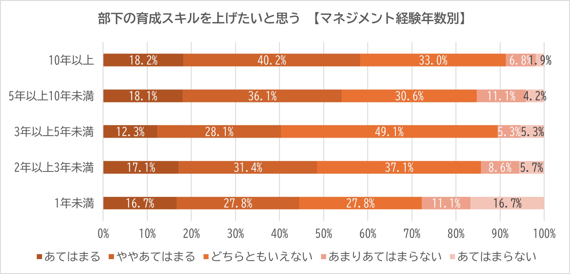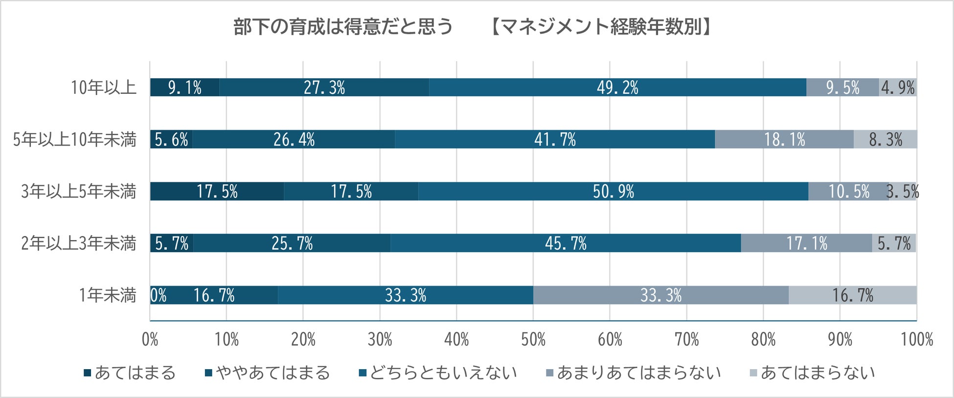 マネジメント経験年数ごとに見てみると、「あてはまる」と最も多く回答したのは「3年以上5年未満」の経験年数となった。「1年未満」の経験年数については、「あてはまる」は0にもかかわらず「ややあてはまる」が33%とどの年数よりも高い結果となった一方で、「あまりあてはまらない」「あてはまらない」を足した割合は「1年未満」が約半数とトップとなり、マネジメント初年度は自身の業務成果の捉え方に差が明確に出ていることがわかった。「あまりあてはまらない」「あてはまらない」の足し合わせた割合は、次いで「5年以上10年未満」の経験年数で約3割となった。