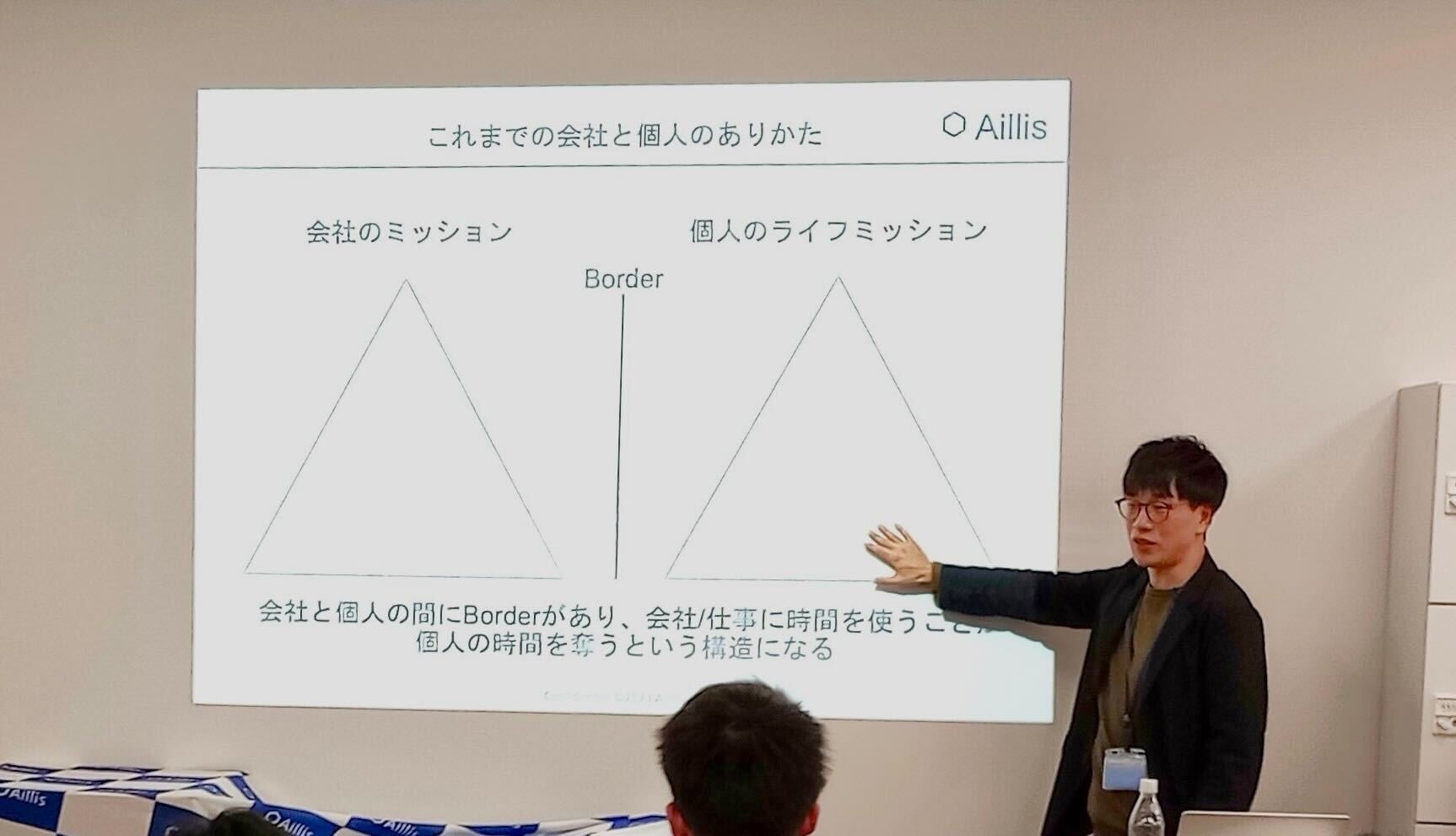 田中は、リクルート、SMSで事業開発を経験。創業者沖山との出会いを経てアイリスに入社した自身のキャリアを元に、AIを活用することで、非医療者であっても未来の医療をつくることに参加できること、またアイリスのミッション「みんなで共創できる、ひらかれた医療をつくる。」が実現した未来での働き方について、ワークショップを交えた講義を行いました。