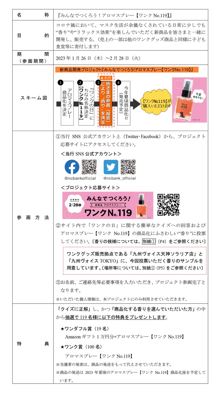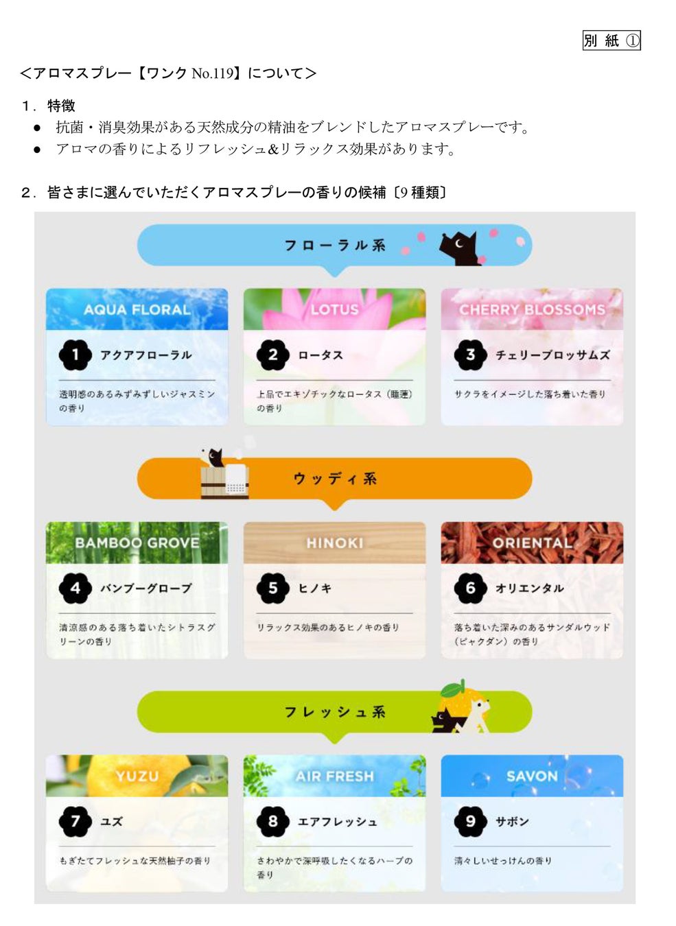 このプロジェクトでは、皆さまの投票により商品化するアロマスプレーの"香り"を決定のうえ、商品名を【ワンクNo.119】として、今夏を目途にワンクグッズ取扱店舗または大賀薬局(一部店舗)での販売を目指します。