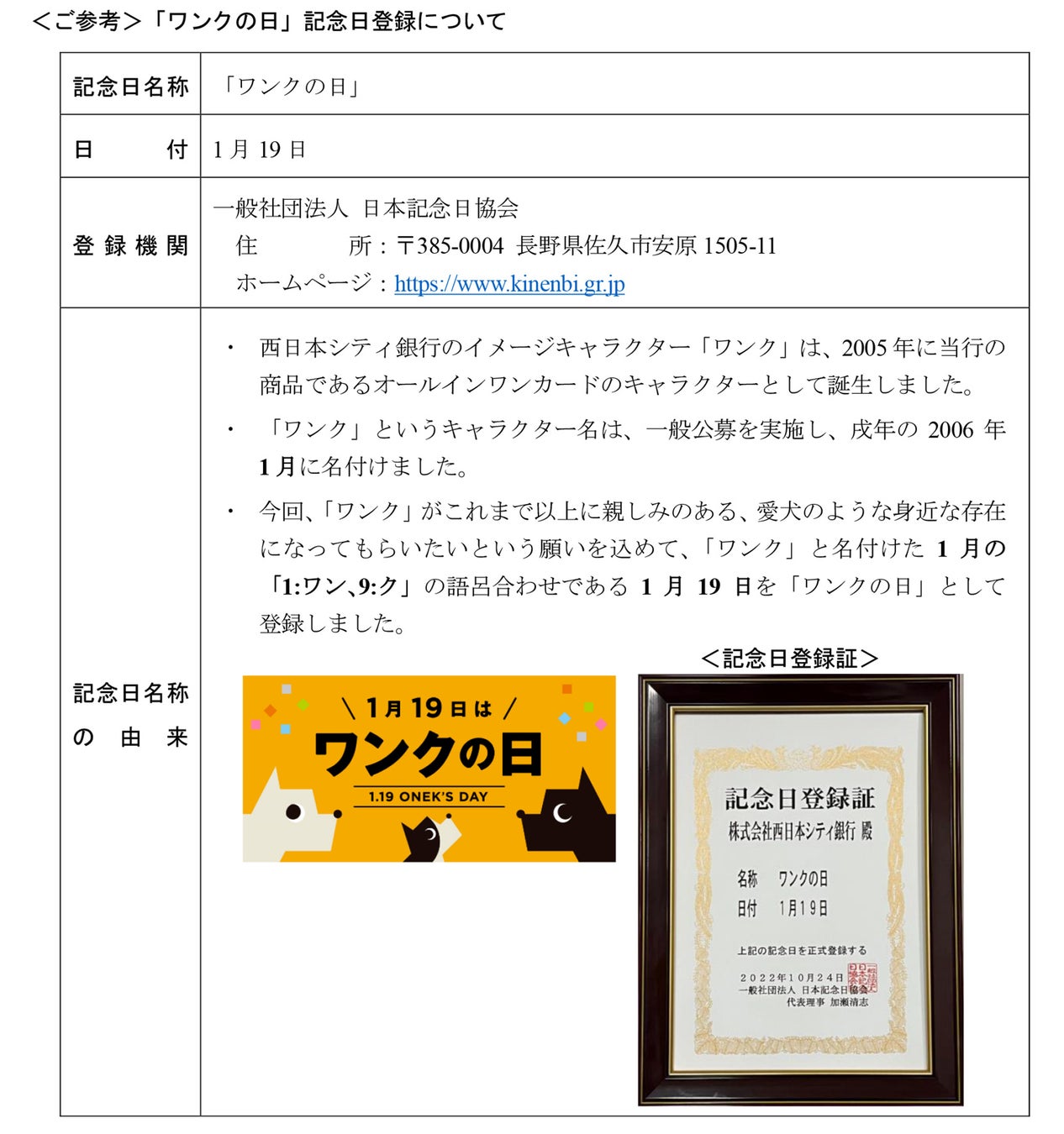 西日本シティ銀行(頭取 村上 英之)は、1月19(ワンク)日を「ワンクの日」として、一般社団法人日本記念日協会※1(代表理事 加瀬 清志)に申請し、記念日登録しました。銀行がオリジナルキャラクターにちなんだ記念日を登録することは全国で初めてです。