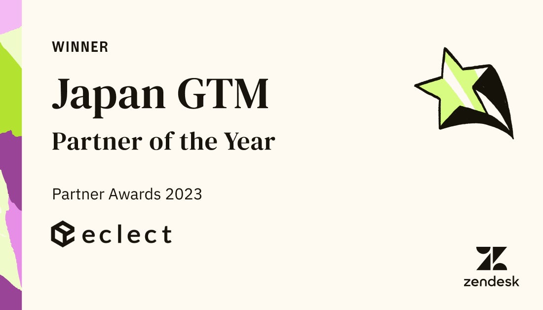この度、株式会社エクレクト様が、「GTM Partner of the Year – Japan」を受賞されたことを心よりお祝い申し上げます。2017年の創業当初より、エクレクト様には、Zendeskサービスの販売、技術コンサルティングや導入支援、伴走サポートに至るまで幅広い支援をしていただき、日本におけるZendeskビジネスの成長に大きく貢献していただいてきました。また、受賞理由の1つには、市場のニーズを的確に捉え、Zendeskを中心としたLINEや各種AIエンジンとのAPI連携をはじめ、さまざまなサービスを繋ぎ合わせることで、より付加価値の高いZendesk活用とCX向上を支援したことが評価された点があげられます。
