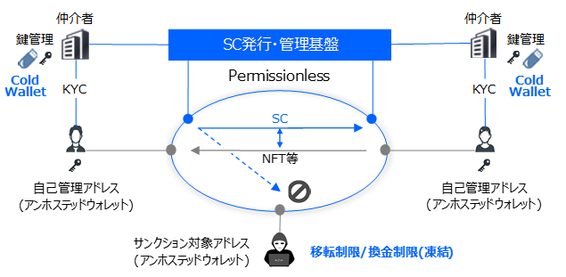 パーミッションレスSCについては、ネットワークアクセスに許可が必要なパーミッションドBCと異なり、パーミッションレス型BCが内在するリスク特性を踏まえたスキーム面・技術面の工夫が必要です。