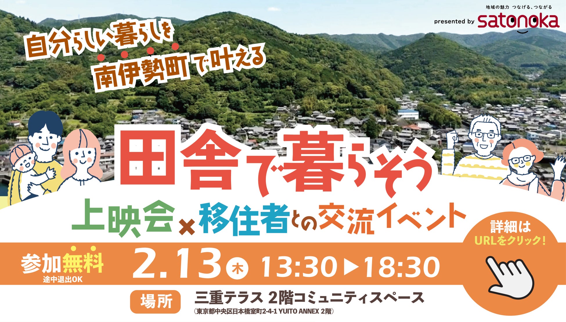 日本デジタル配信株式会社(JDS)は、地域情報チャンネル「satonoka4K/TV」で放送中の番組『田舎で暮らそう ~移住の先に見えるもの~』(以下、『田舎で暮らそう』)において、昨年7月に放送した三重県・伊勢志摩編の上映会イベントを東京・日本橋にある三重県の魅力発信&交流の場「三重テラス」にて、三重県南伊勢町と共催で開催いたします。