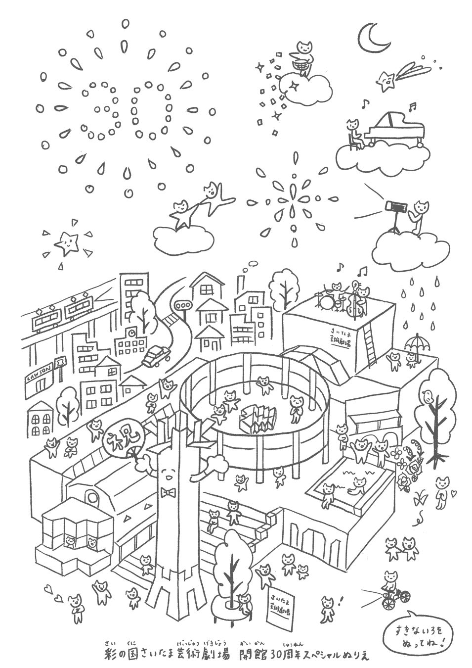 リニューアルし開館30周年を迎えた彩の国さいたま芸術劇場。円形の広場・ロトンダのガラスブロックは虹色に輝きます。花火とまちの灯りも、色とりどりに光って30周年をお祝いしています。あなたの自由なイメージで、30周年のおまつりを彩ってください!
