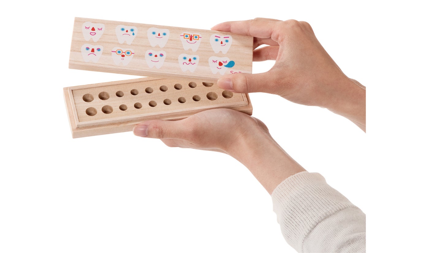 大小の穴に、前歯と奥歯を20本収納できる乳歯ケース。