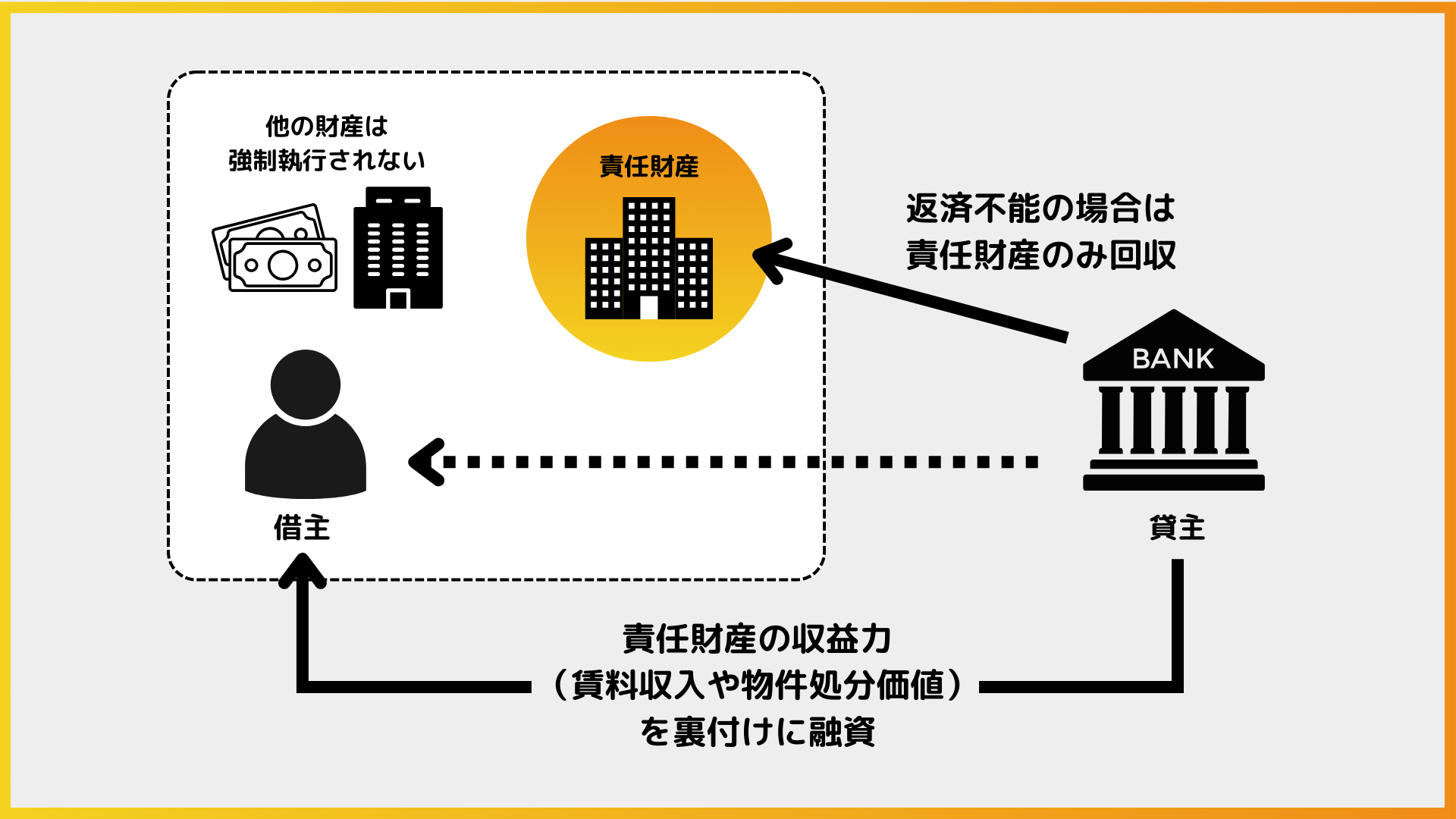 特定の不動産のみを担保とし、その不動産から得られる収益(賃料収入や物件処分価値)を返済原資とするローンのことです。