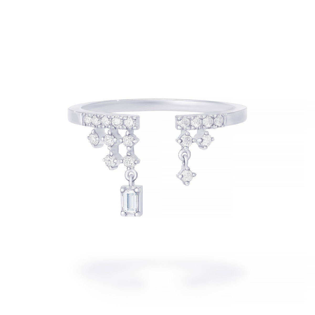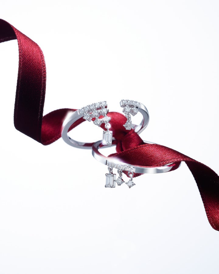 また、ダイヤモンドが繊細に揺れ、手元に気品を添える「シャンデリア スウェイ リング」。存在感のあるバゲットカットダイヤモンドが動きに合わせて瑞々しい輝きを放つオープンリングは、優美でシックな佇まい。「シャンデリア スウェイ プチ リング」は、ミニマルで軽やかなつけ心地。フレキシブルに揺れるダイヤモンドがさりげなく煌めき、手元にモダンなエレガンスを生み出します。