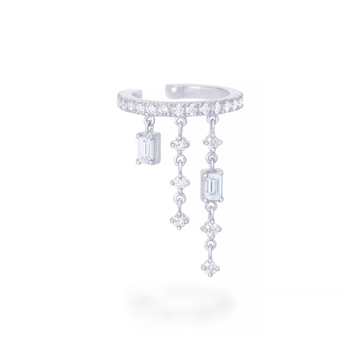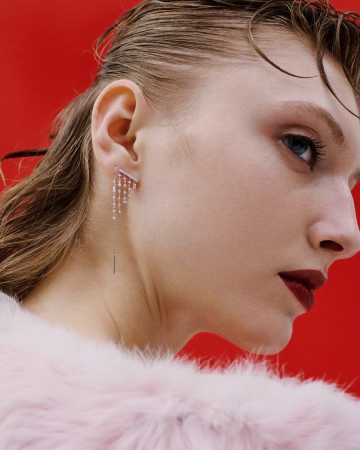 動くたびに軽やかに優雅に煌めく「シャンデリア スウェイ ピアス」。バゲットカットダイヤモンドとラウンドブリリアントカットダイヤモンドのスレッドが、ドラマチックなハーモニーを奏でる。「シャンデリア スウェイ チェーン ピアス」とレイヤードして、横顔をリュクスにドレスアップ。幾重にも変化する輝きのレイヤードは身に纏う方の魅力を惹き出します。